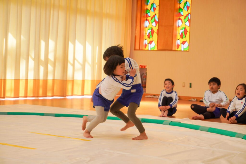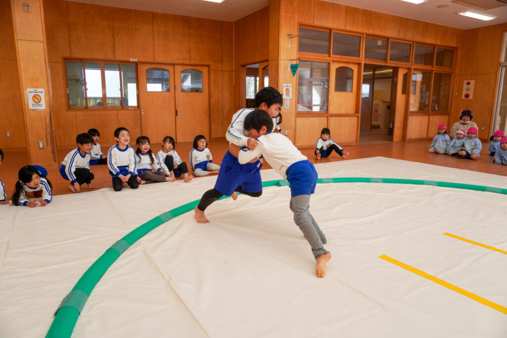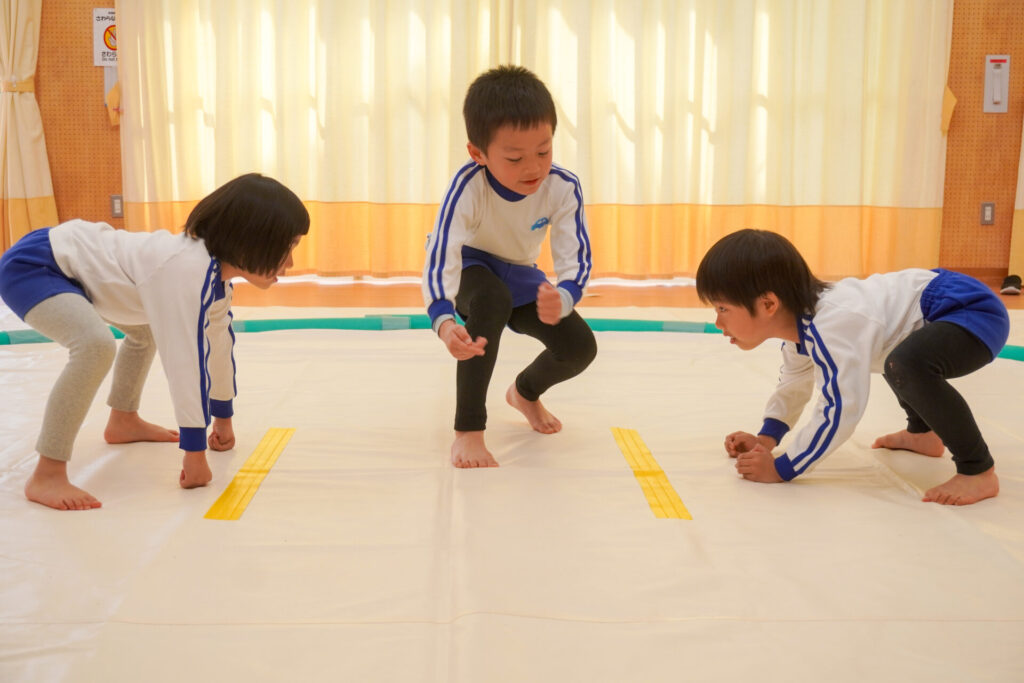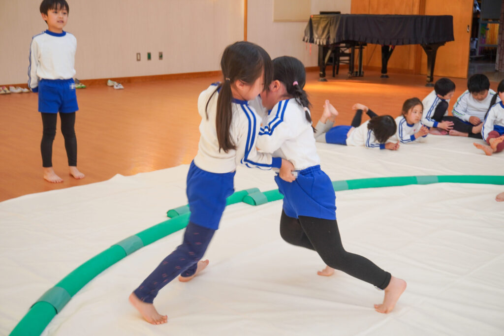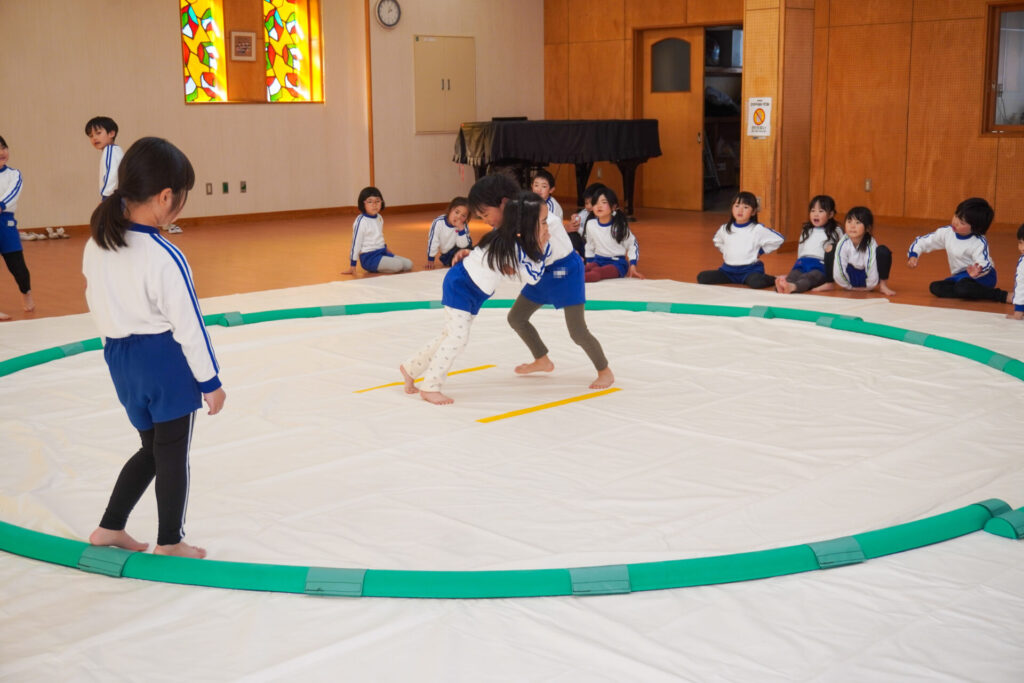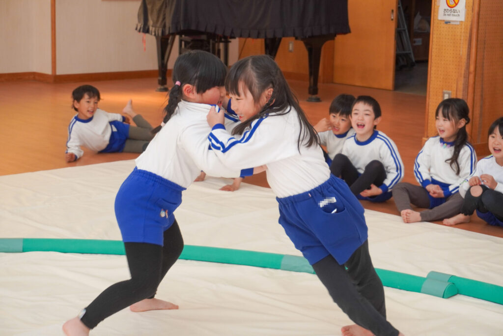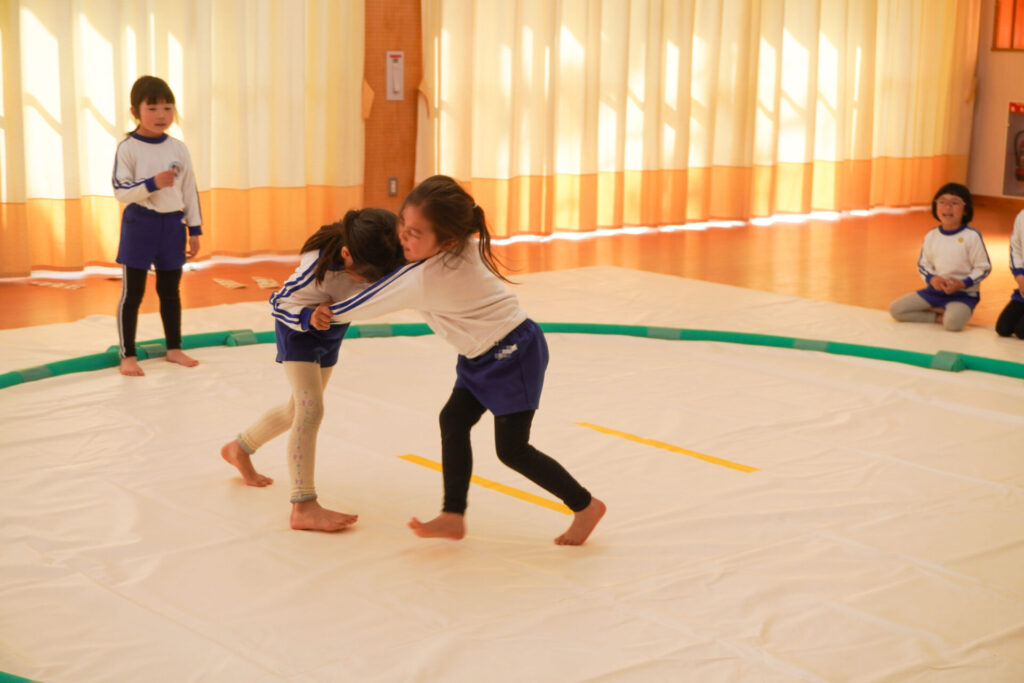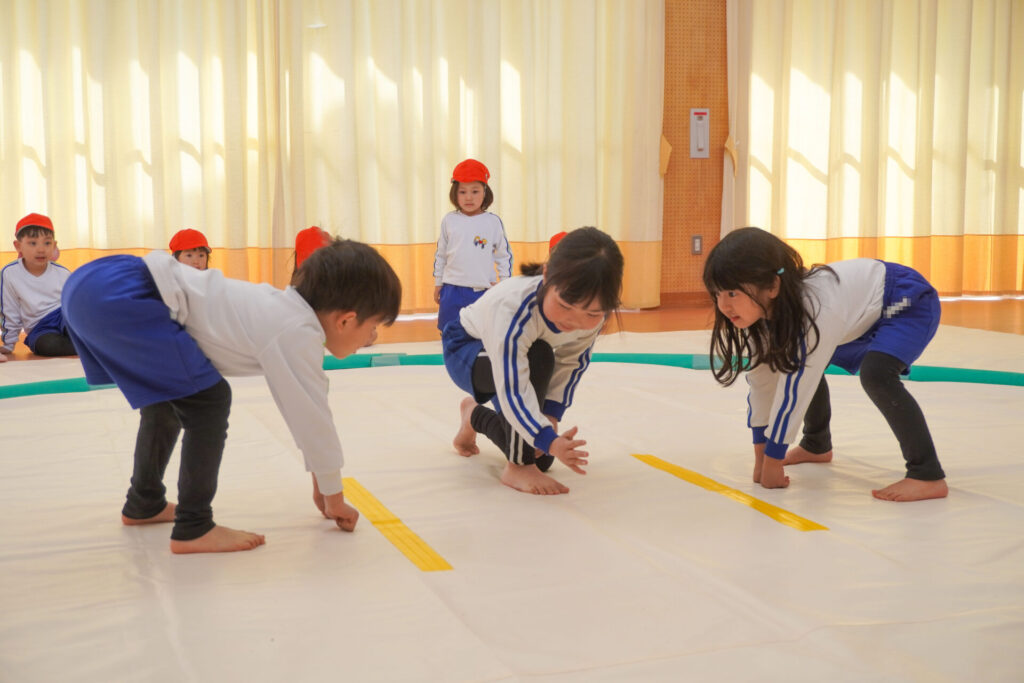園での様子 相撲(年長・年中) madokahp 2026年2月6日 年長つき組・年中さくら組が「相撲」で遊んでいます。ホールには大きな土俵です!クラスごと「〇〇部屋」と名付け、グループを作ったり、団体戦や個人戦で戦ううちに「相撲」への興味や意欲が高まってきました。 自分の名前を入れた「四股名」も決まり、すっかり「ちびっこ力士」です!真っ向から向かっていく子、足取りを狙う子、左右に交わす子…「勝ち」を狙いに挑んだ懸命な姿が印象的でした。 来週はいよいよ「相撲大会~まどか場所~」です!「はっきよい!のこった!のこった!」白熱した「大相撲」が見られるのが今から楽しみです!