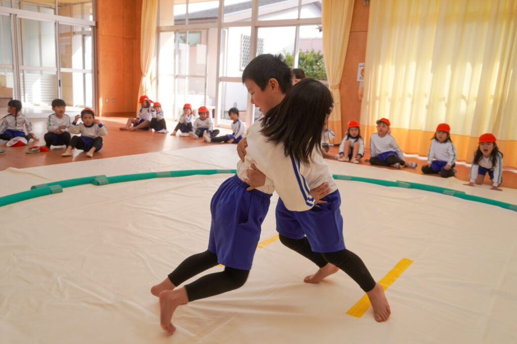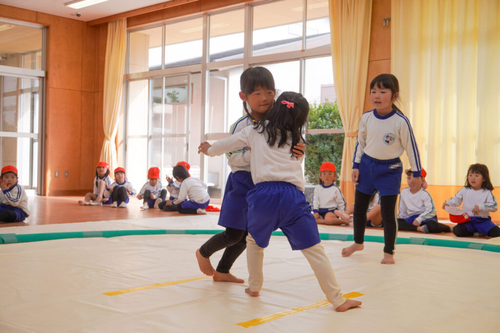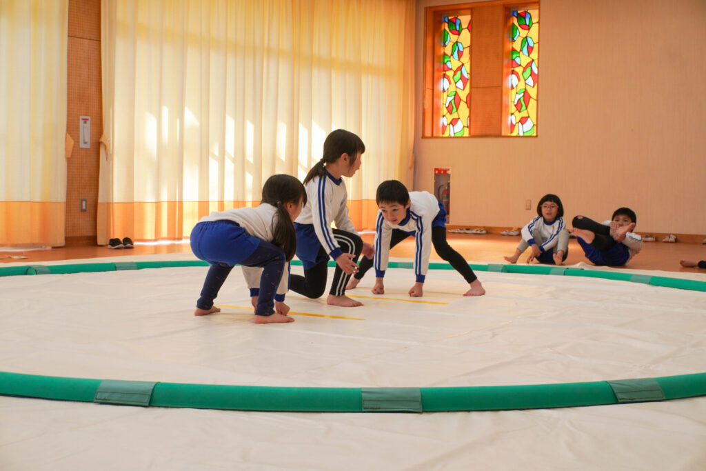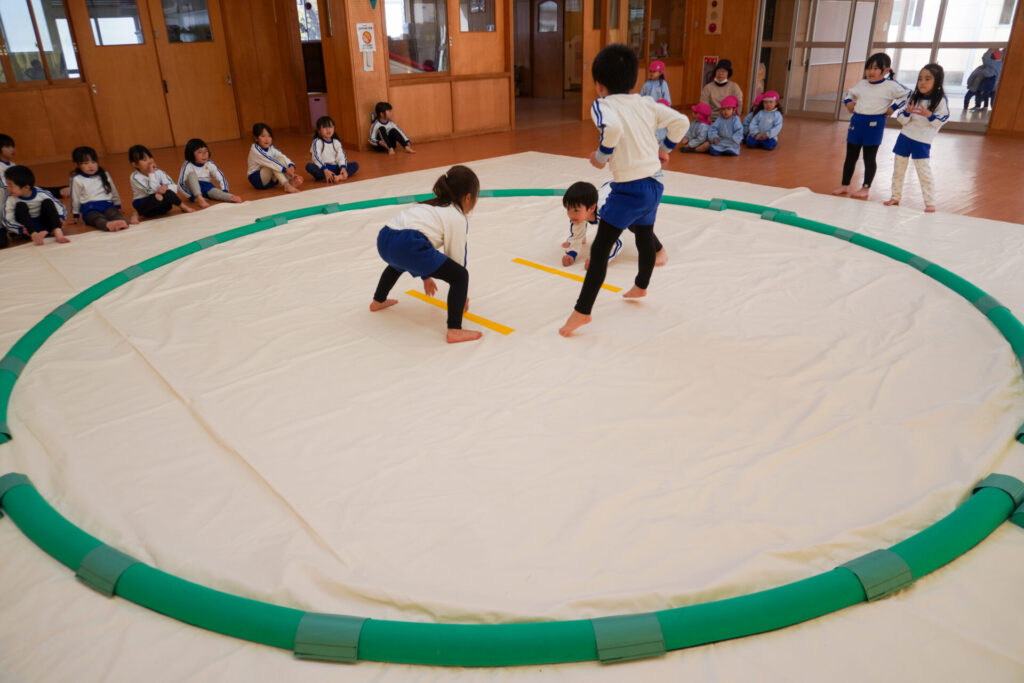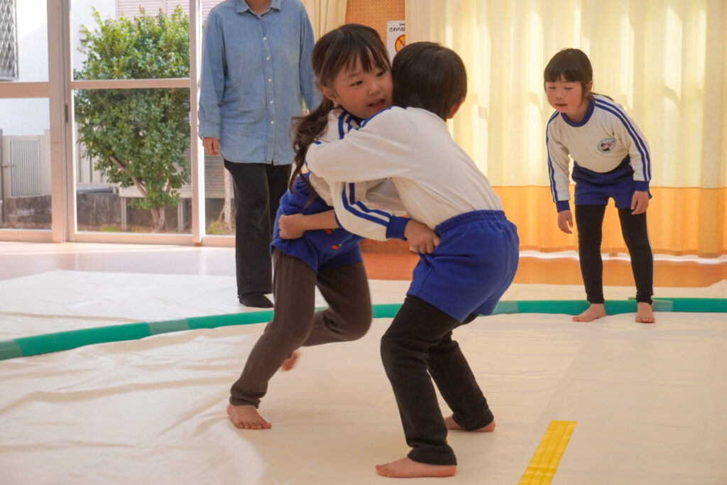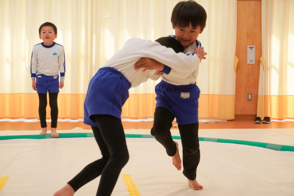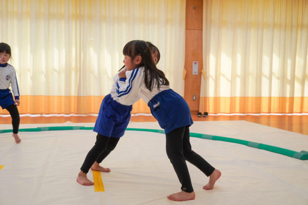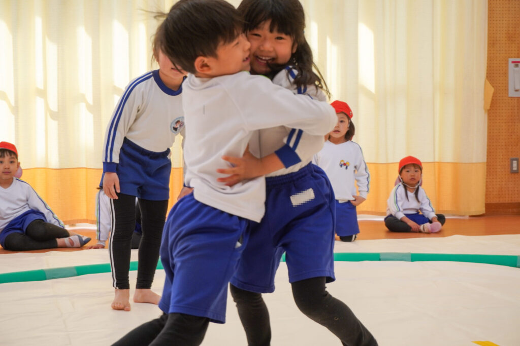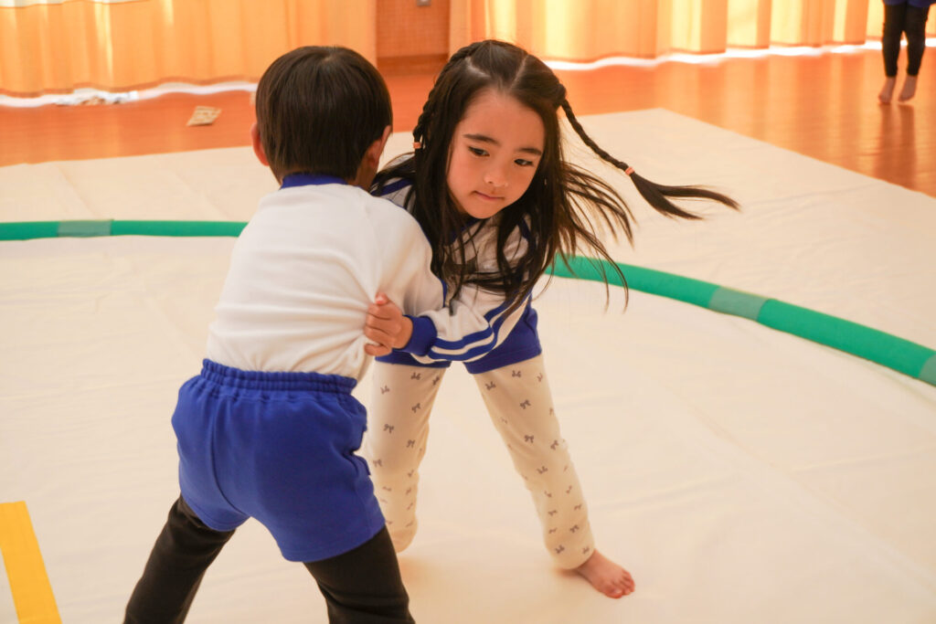 園での様子 相撲(年長・年中) madokahp 2026年2月6日 年長つき組・年中さくら組が「相撲」で遊んでいます。ホールには大きな土俵です!クラスごと「〇〇部屋」と名付け、グループを作ったり、団体戦や個人戦で戦ううちに「相撲」への興味や意欲が高まってきました。 自分の名前を入れた「四股名」も決まり、すっかり「ちびっこ力士」です!真っ向から向かっていく子、足取りを狙う子、左右に交わす子…「勝ち」を狙いに挑んだ懸命な姿が印象的でした。 来週はいよいよ「相撲大会~まどか場所~」です!「はっきよい!のこった!のこった!」白熱した「大相撲」が見られるのが今から楽しみです!
