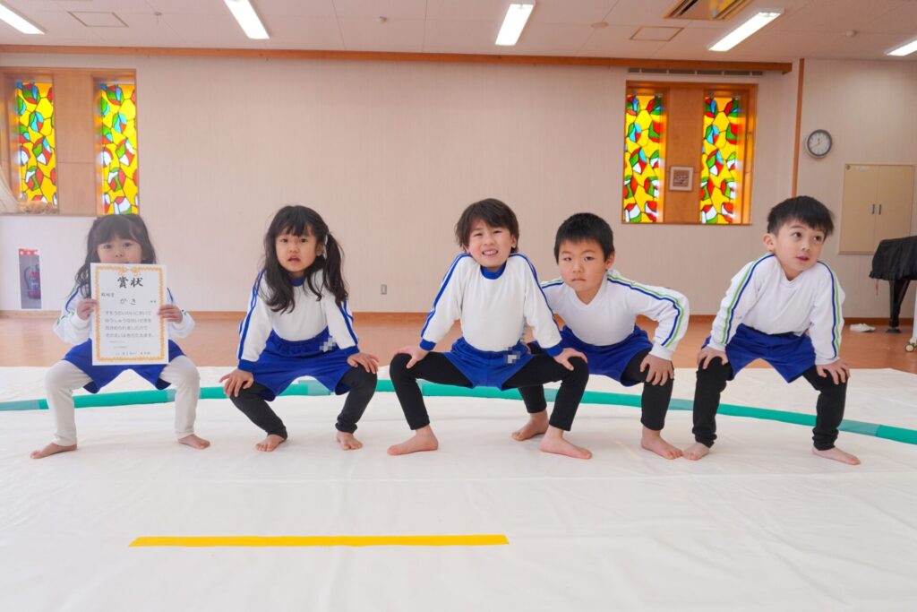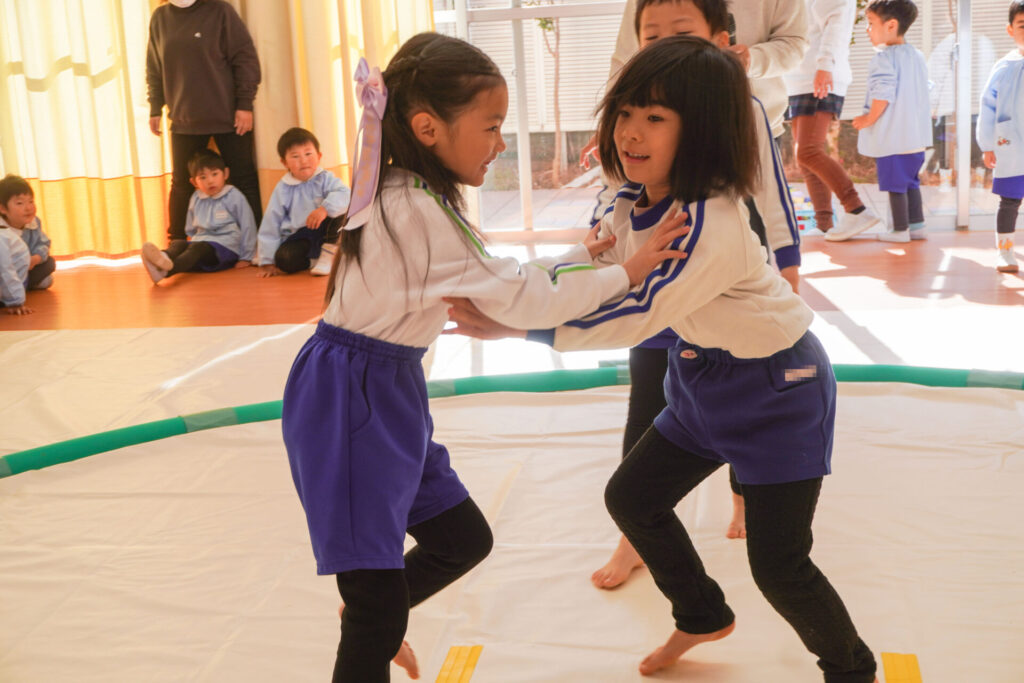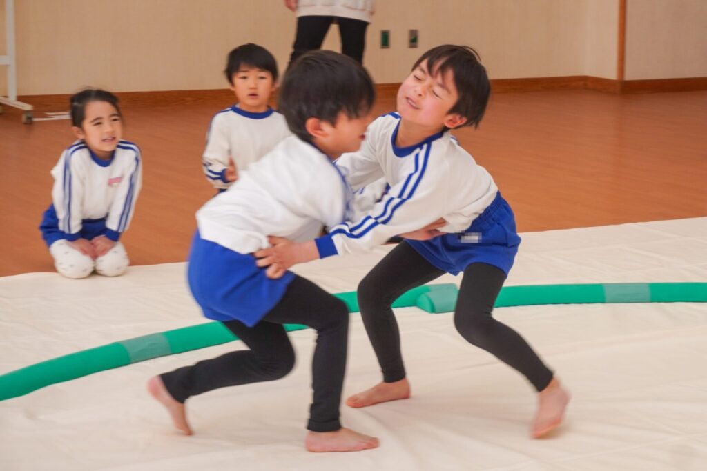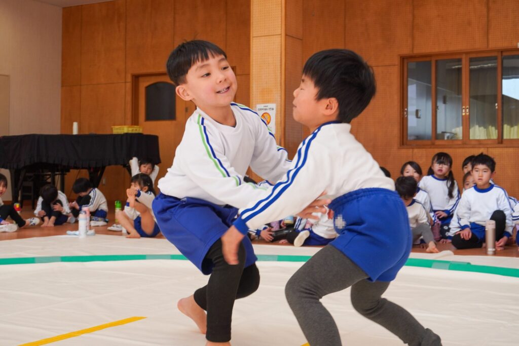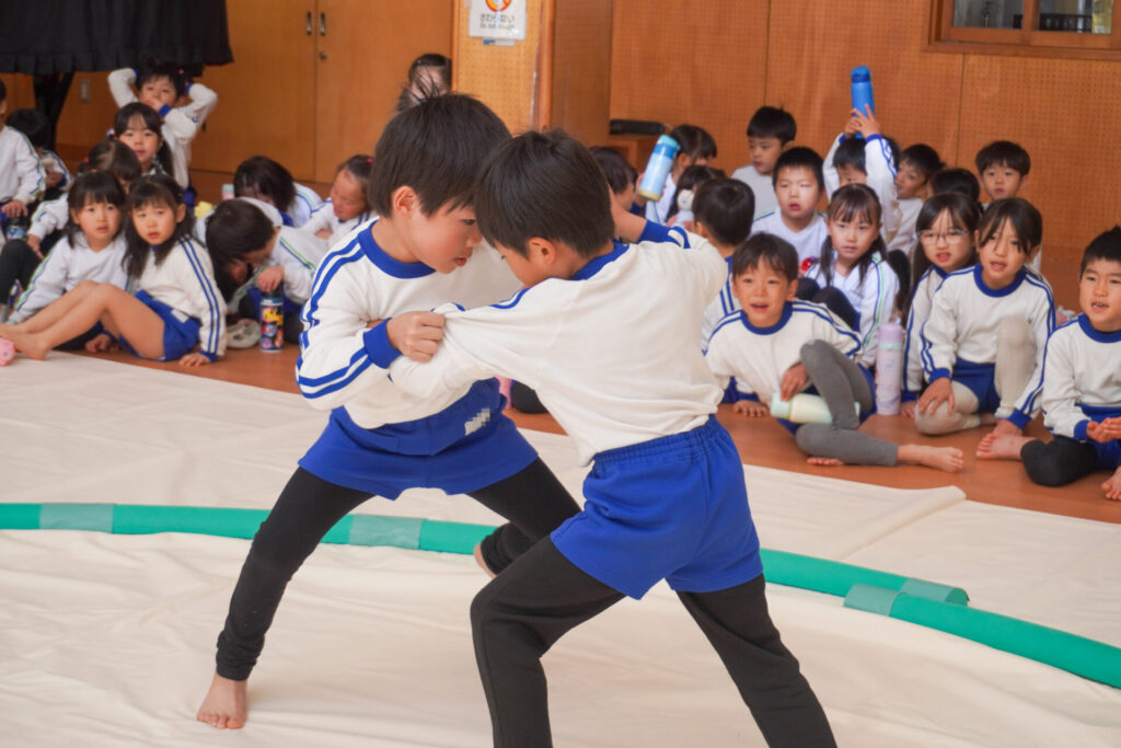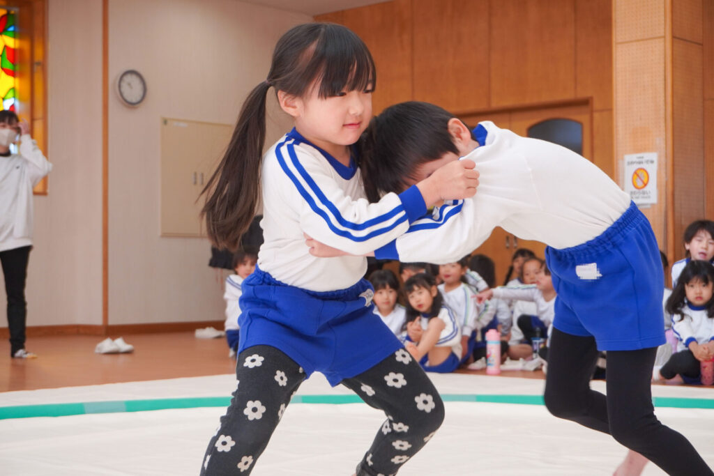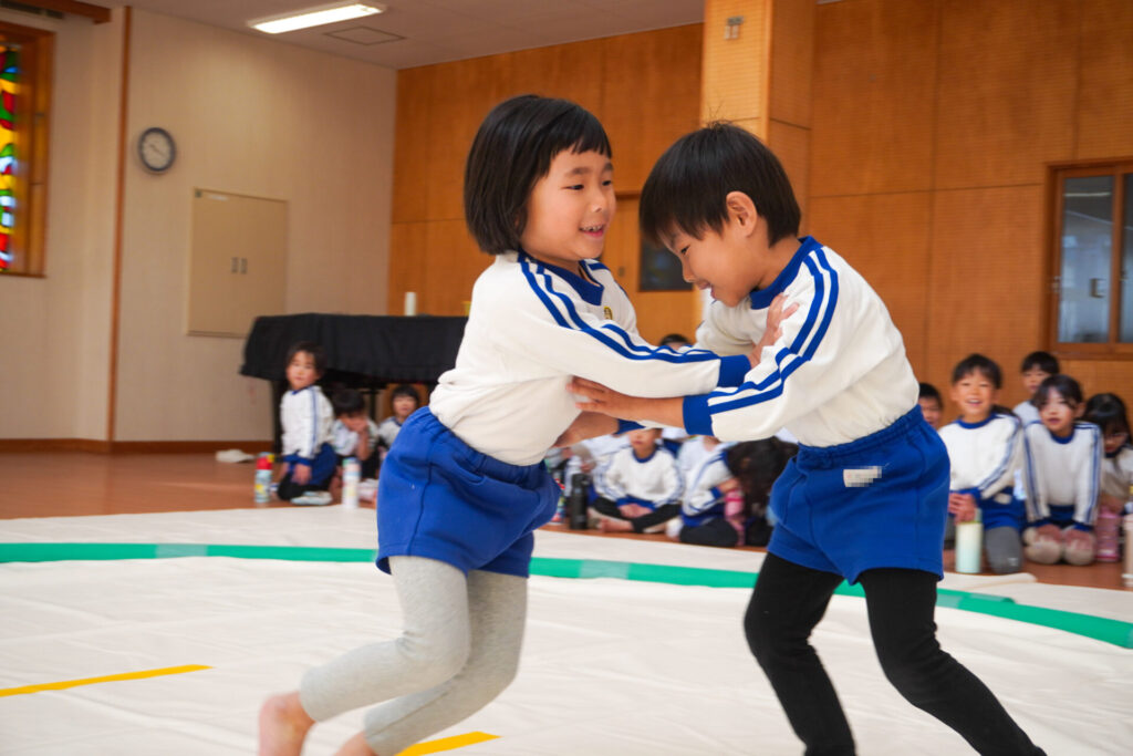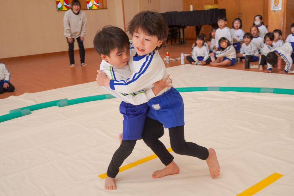 園での様子 まどか杯~相撲大会~(年長・年中) madokahp 2026年2月10日 年長つき組と年中さくら組でが「まどか杯」と題し、相撲大会を行いました。今日は各クラス「部屋」を作り、団体戦の勝ち抜きトーナメントにて、取組を行いました。 「はっきよい のこった!」の審判の合図で、相撲が始まります。組んで、足をとって、突っ張って、交わして…次々に粘りの相撲を披露しました。 土俵際の逆転を狙う年長つき組、真っ向から立ち向かっていく年中さくら組、どちらも「負けたくない!」という強い気持ちが伝わってきました。 取組の間に応援隊の年少ゆり組・ばら組、満3歳バンビ組と職員による「ぶつかり稽古」を行いました。仕切り線に手をついて「はっきよい!のこった!」で、懸命に押して押して押して…結果はすべて「ゆり組・ばら組・バンビ組の豆力士」の勝ち!押す力が強く、びっくりしました。 そしていよいよ大詰め、「4部屋」による決勝トーナメントへ!負けて泣いて悔しがる子、勝って喜ぶ子…いろいろな気持ちが交差した相撲大会になりました。 優勝 カービィ部屋(つき組)準優勝 すいか部屋(さくら組) 今日は12の部屋に分かれての団体戦、勝ち抜きトーナメントでしたが、どの部屋も見ごたえある相撲をとりました。勝っても相手を称えて労うつき組、負けて悔しい気持ちをぐっと押さえてきちんと礼をしたさくら組、勝っても負けても「見せ場」をつくった「まどか杯~相撲大会~」になりました。相撲を通して、心身ともにもっと強くなってほしいと願っています。