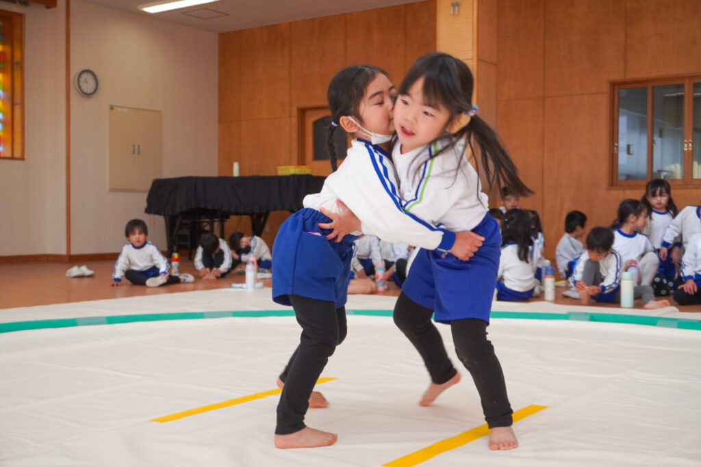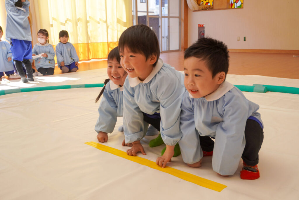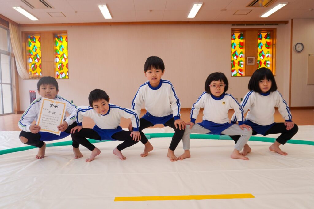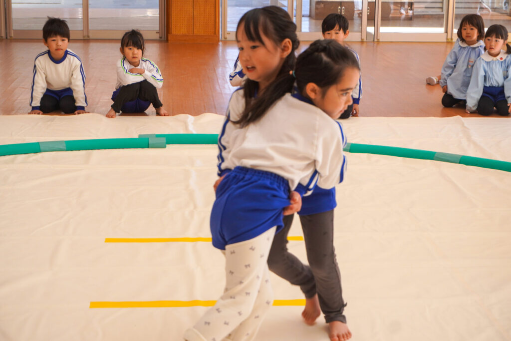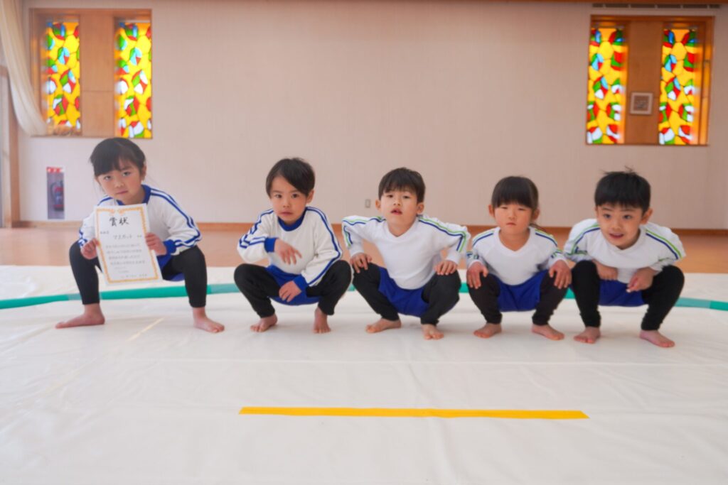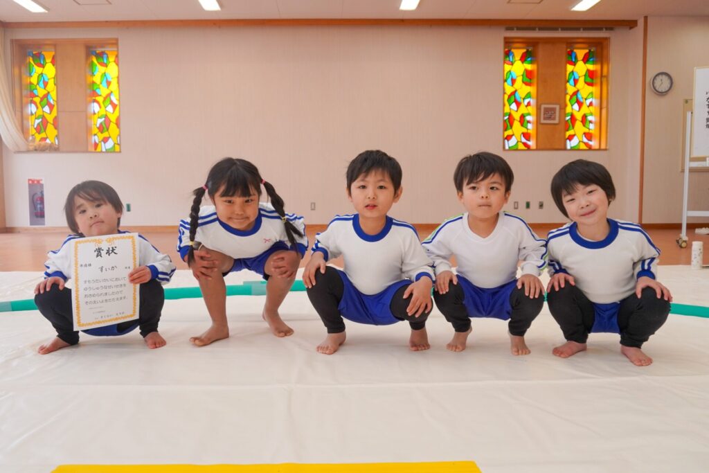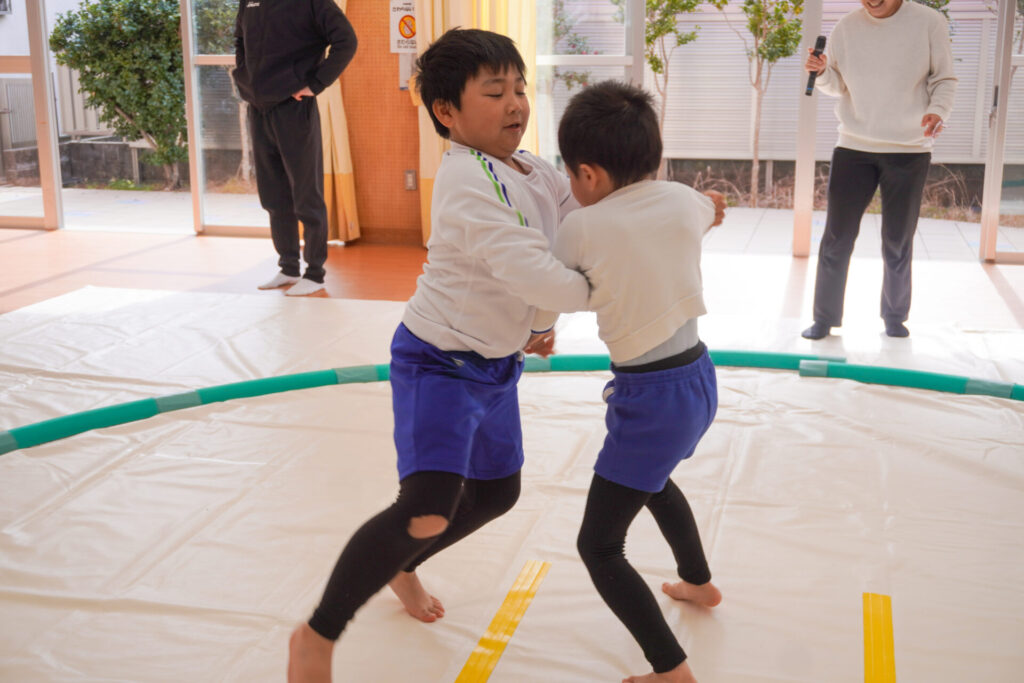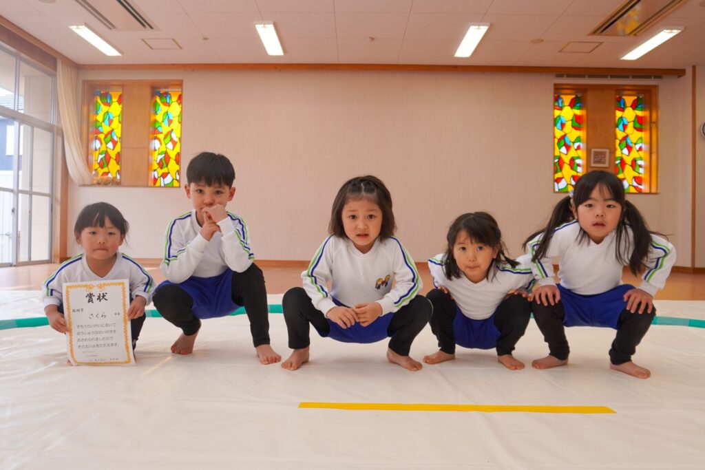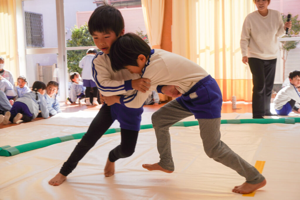 園での様子 まどか杯~相撲大会~(年長・年中) madokahp 2026年2月10日 年長つき組と年中さくら組でが「まどか杯」と題し、相撲大会を行いました。今日は各クラス「部屋」を作り、団体戦の勝ち抜きトーナメントにて、取組を行いました。 「はっきよい のこった!」の審判の合図で、相撲が始まります。組んで、足をとって、突っ張って、交わして…次々に粘りの相撲を披露しました。 土俵際の逆転を狙う年長つき組、真っ向から立ち向かっていく年中さくら組、どちらも「負けたくない!」という強い気持ちが伝わってきました。 取組の間に応援隊の年少ゆり組・ばら組、満3歳バンビ組と職員による「ぶつかり稽古」を行いました。仕切り線に手をついて「はっきよい!のこった!」で、懸命に押して押して押して…結果はすべて「ゆり組・ばら組・バンビ組の豆力士」の勝ち!押す力が強く、びっくりしました。 そしていよいよ大詰め、「4部屋」による決勝トーナメントへ!負けて泣いて悔しがる子、勝って喜ぶ子…いろいろな気持ちが交差した相撲大会になりました。 優勝 カービィ部屋(つき組)準優勝 すいか部屋(さくら組) 今日は12の部屋に分かれての団体戦、勝ち抜きトーナメントでしたが、どの部屋も見ごたえある相撲をとりました。勝っても相手を称えて労うつき組、負けて悔しい気持ちをぐっと押さえてきちんと礼をしたさくら組、勝っても負けても「見せ場」をつくった「まどか杯~相撲大会~」になりました。相撲を通して、心身ともにもっと強くなってほしいと願っています。