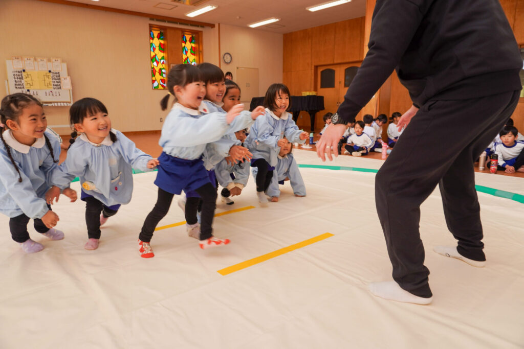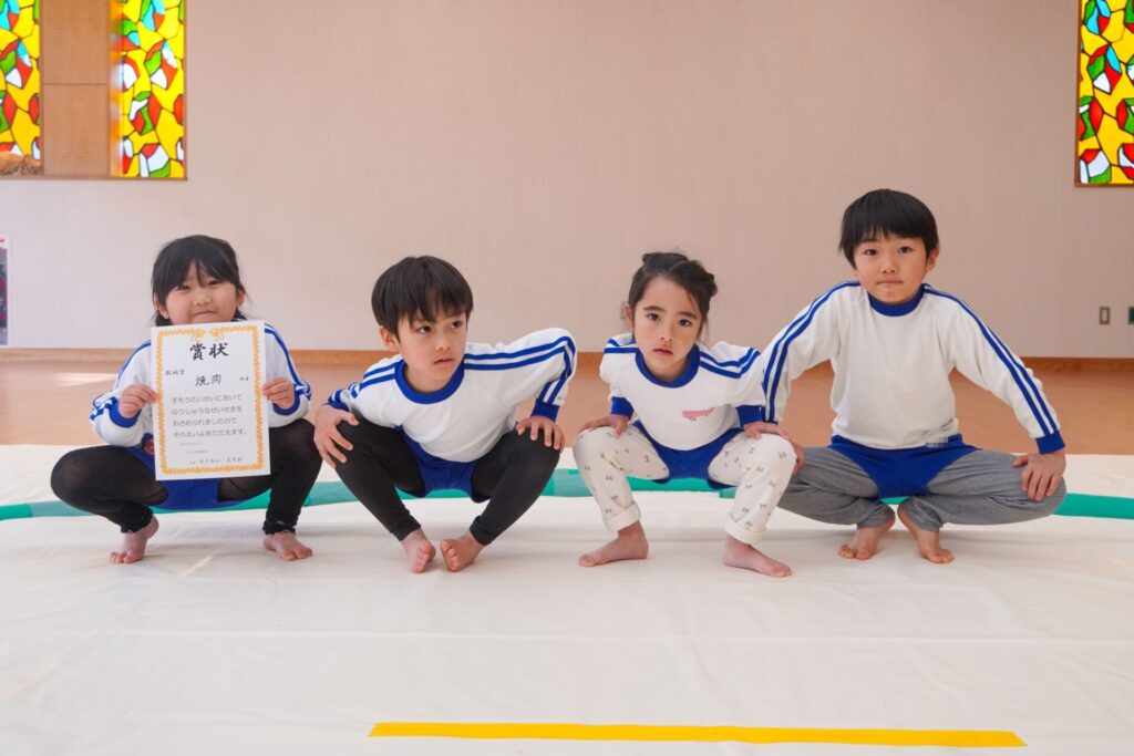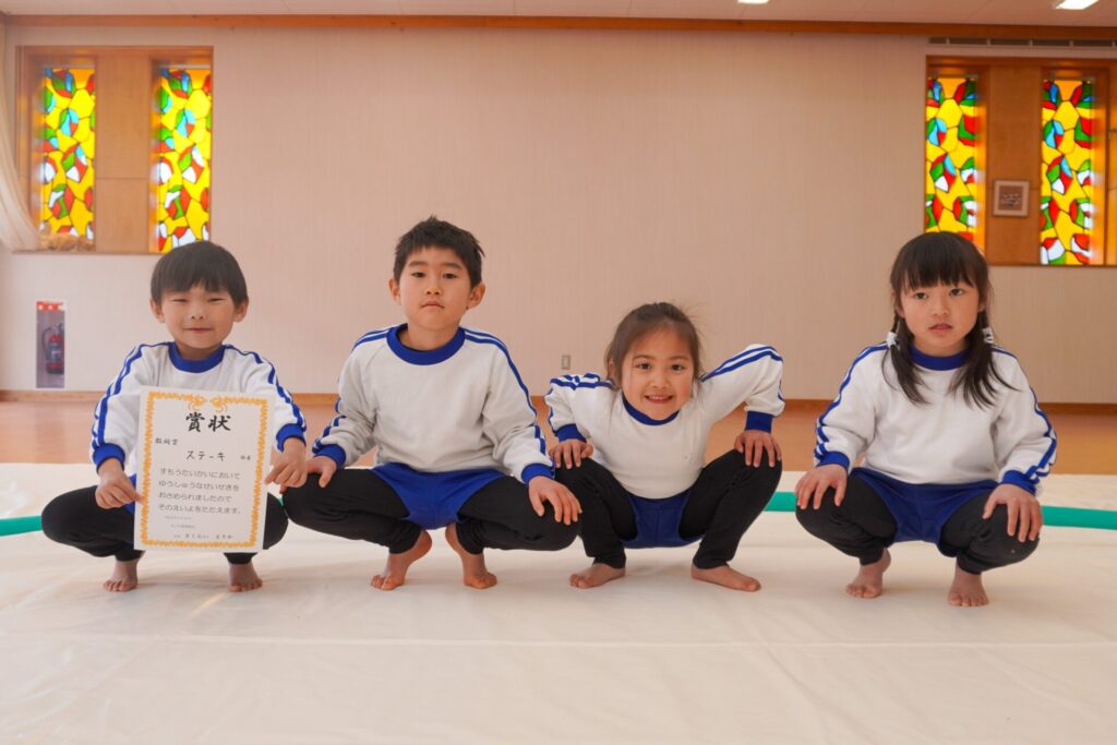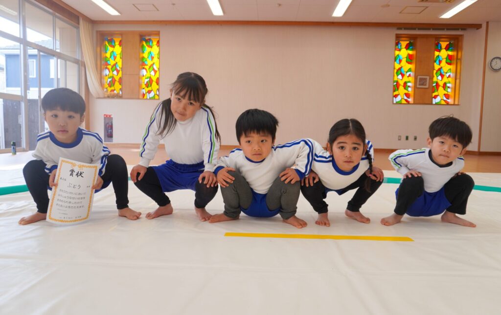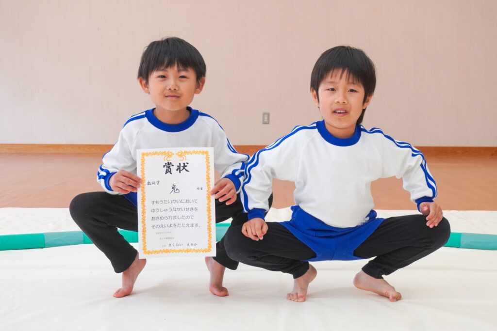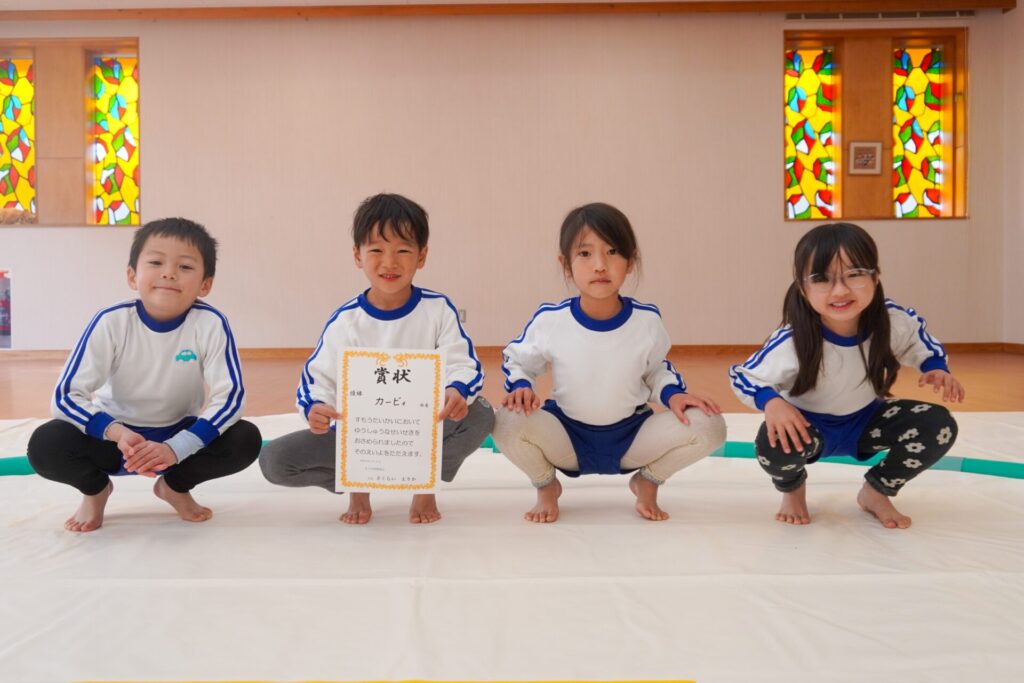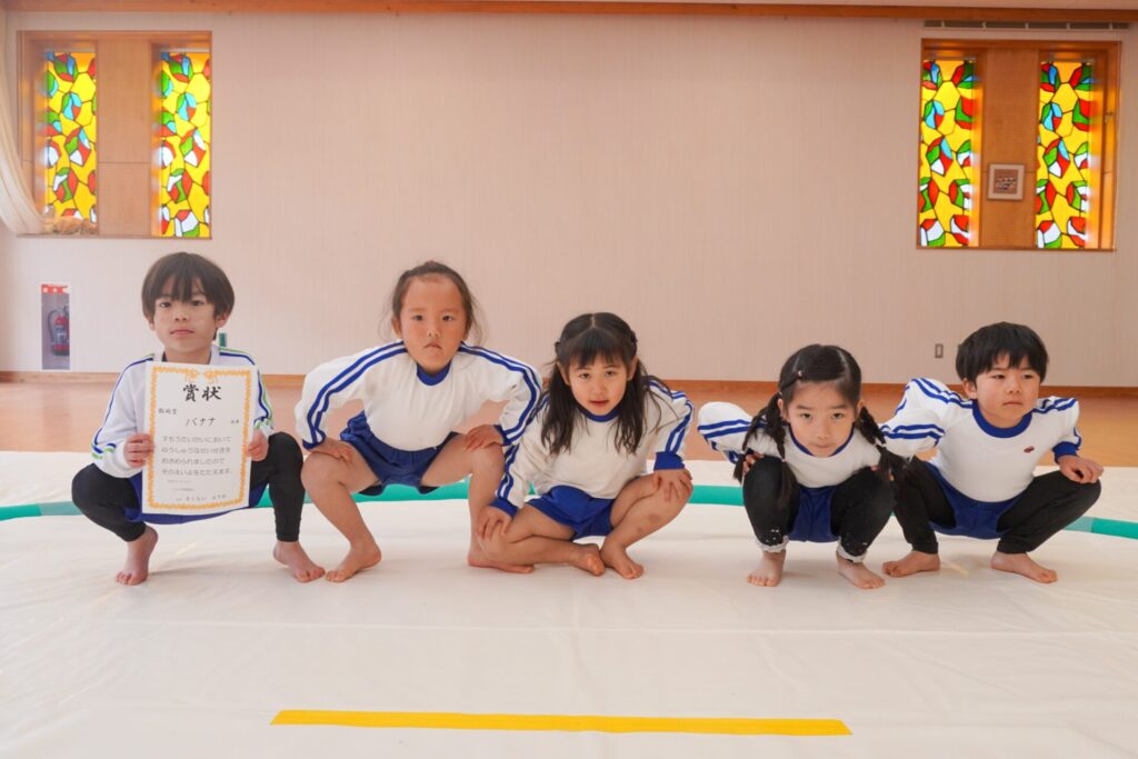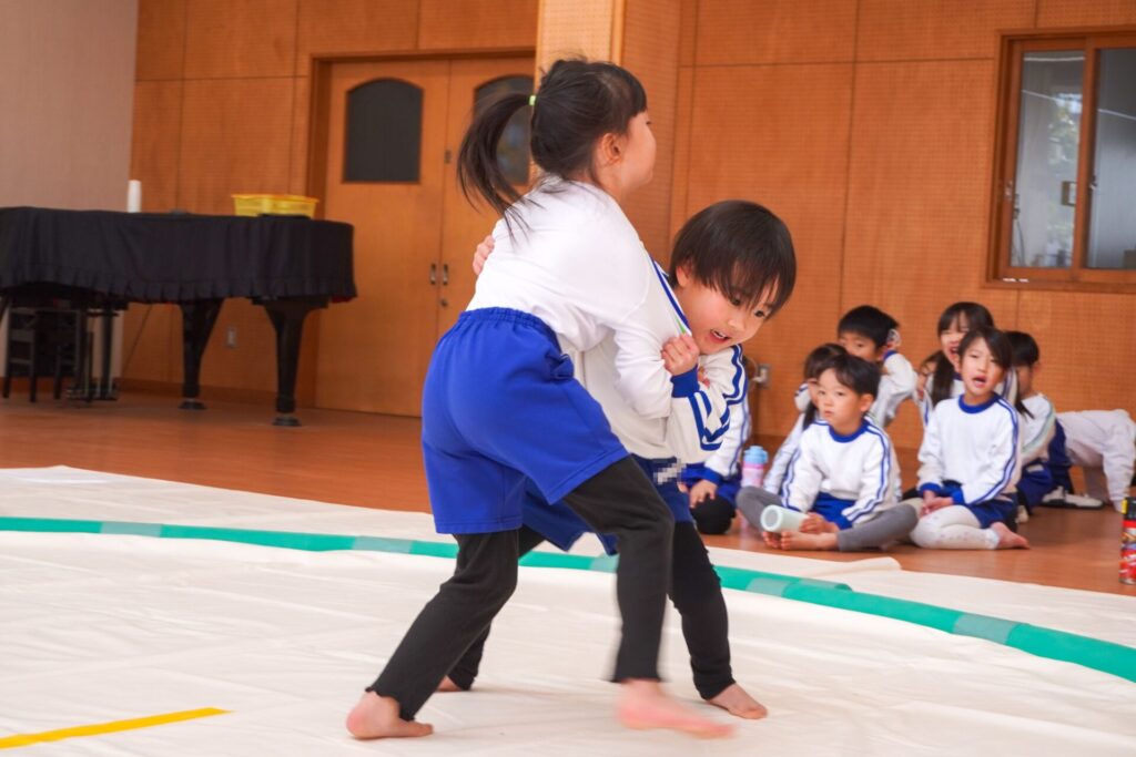 園での様子 まどか杯~相撲大会~(年長・年中) madokahp 2026年2月10日 年長つき組と年中さくら組でが「まどか杯」と題し、相撲大会を行いました。今日は各クラス「部屋」を作り、団体戦の勝ち抜きトーナメントにて、取組を行いました。 「はっきよい のこった!」の審判の合図で、相撲が始まります。組んで、足をとって、突っ張って、交わして…次々に粘りの相撲を披露しました。 土俵際の逆転を狙う年長つき組、真っ向から立ち向かっていく年中さくら組、どちらも「負けたくない!」という強い気持ちが伝わってきました。 取組の間に応援隊の年少ゆり組・ばら組、満3歳バンビ組と職員による「ぶつかり稽古」を行いました。仕切り線に手をついて「はっきよい!のこった!」で、懸命に押して押して押して…結果はすべて「ゆり組・ばら組・バンビ組の豆力士」の勝ち!押す力が強く、びっくりしました。 そしていよいよ大詰め、「4部屋」による決勝トーナメントへ!負けて泣いて悔しがる子、勝って喜ぶ子…いろいろな気持ちが交差した相撲大会になりました。 優勝 カービィ部屋(つき組)準優勝 すいか部屋(さくら組) 今日は12の部屋に分かれての団体戦、勝ち抜きトーナメントでしたが、どの部屋も見ごたえある相撲をとりました。勝っても相手を称えて労うつき組、負けて悔しい気持ちをぐっと押さえてきちんと礼をしたさくら組、勝っても負けても「見せ場」をつくった「まどか杯~相撲大会~」になりました。相撲を通して、心身ともにもっと強くなってほしいと願っています。