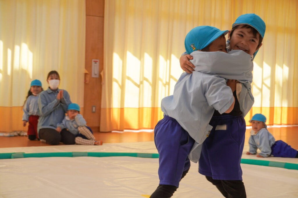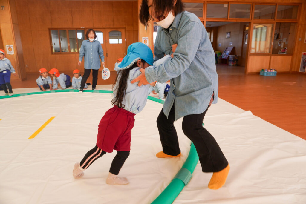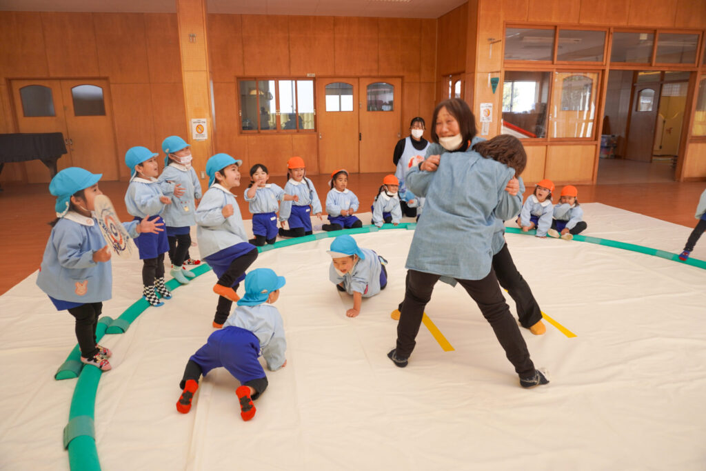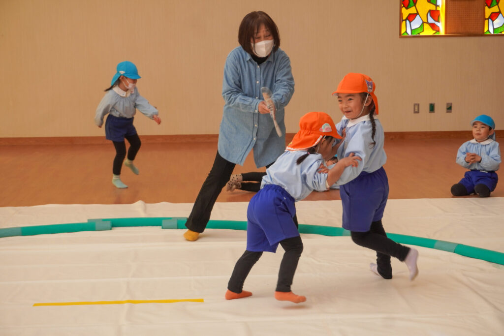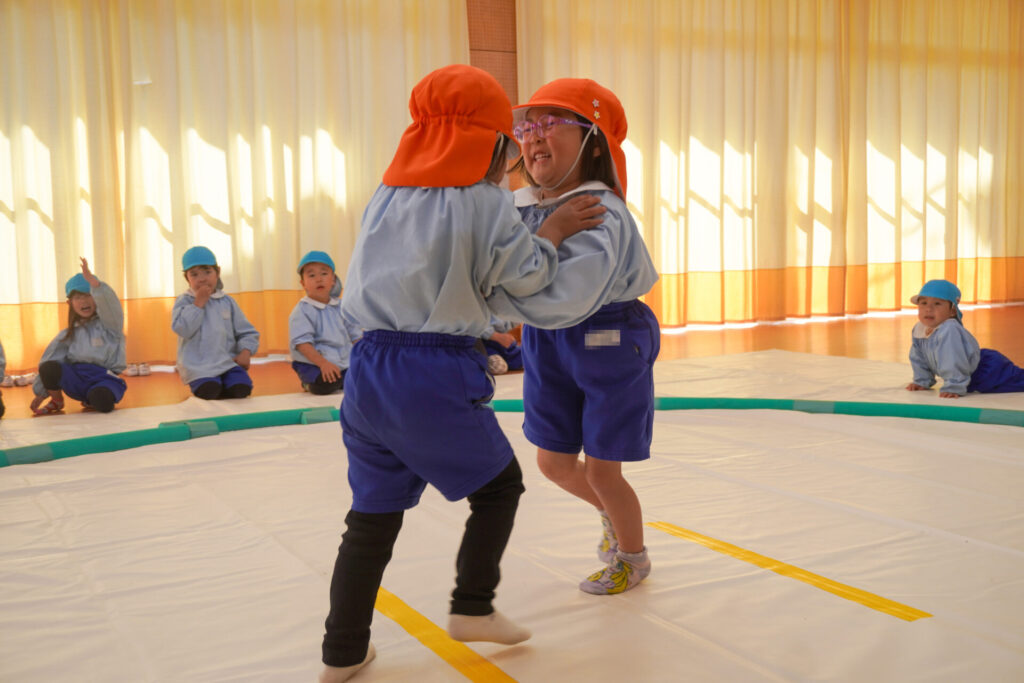 先日、年長つき組と年中さくら組が「まどか杯」と題した「相撲大会」を行い、年少ゆり組・ばら組は「応援隊」として参加しましたが、今日は楽しみにしていた「相撲」で遊びました。