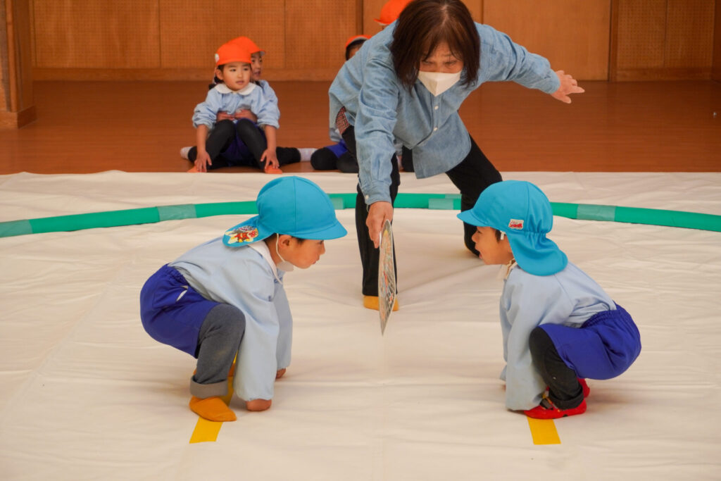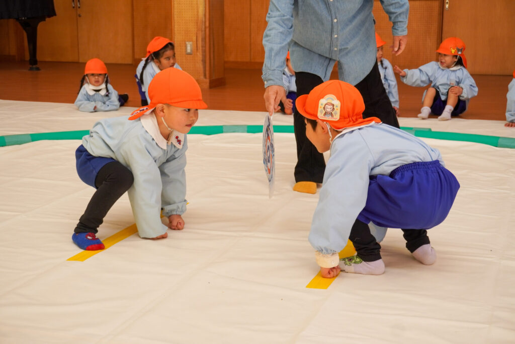 今日は「ちびっこ力士」として、相撲をとる番です!名前を呼ばれると土俵に上がり、仕切り線にちゃんと両手をつくことができました。