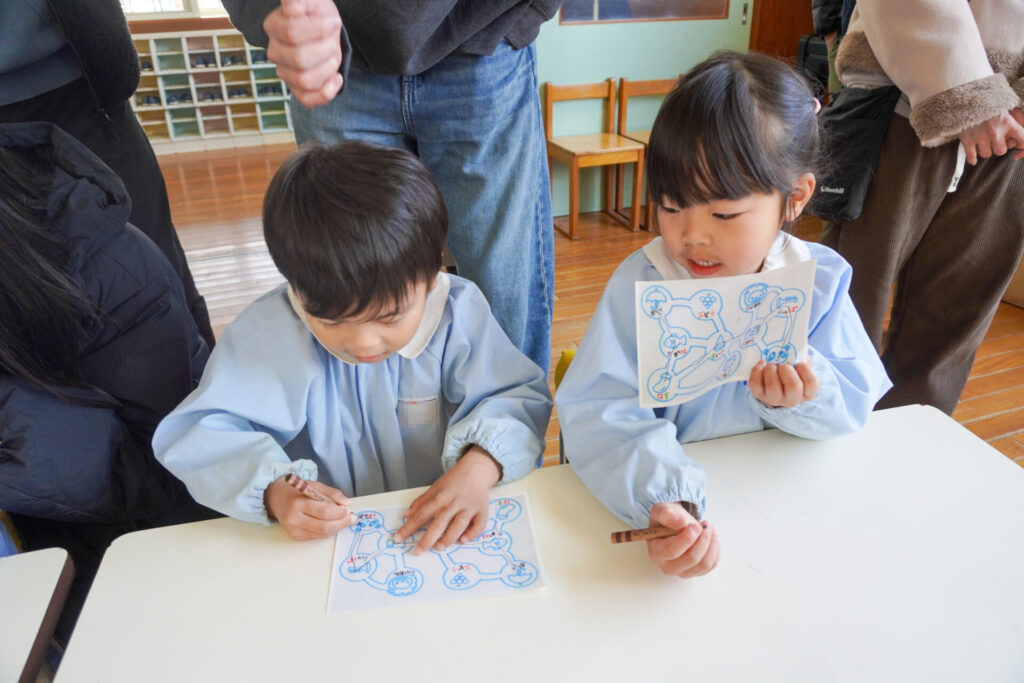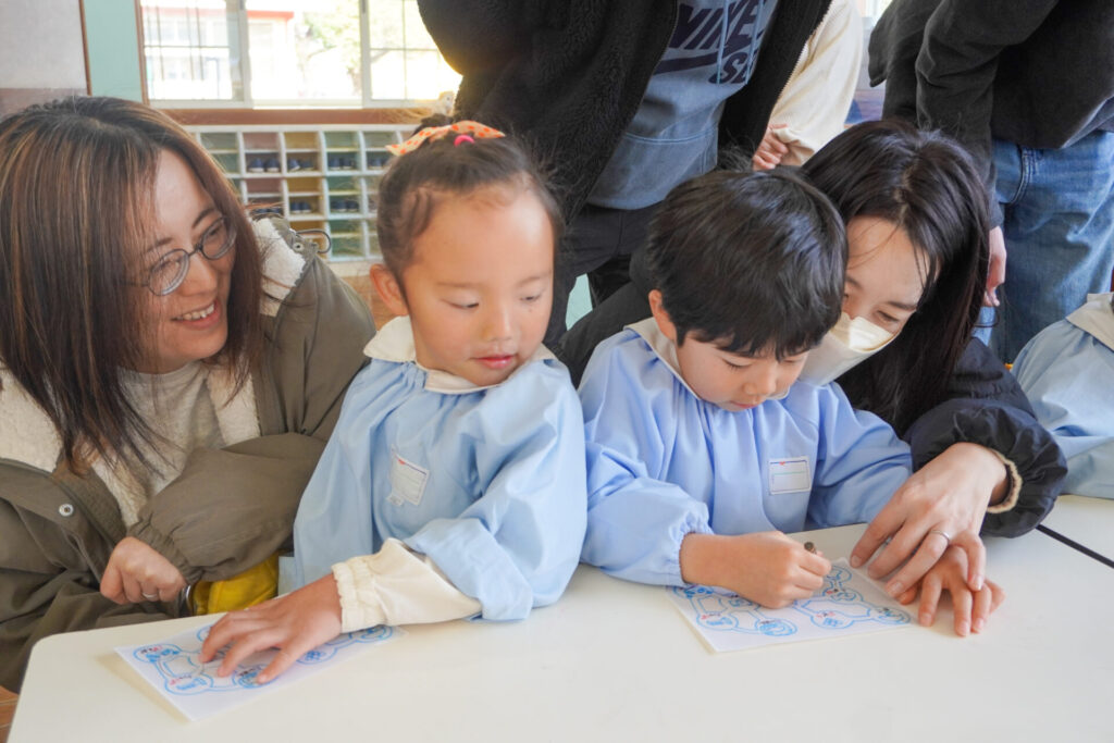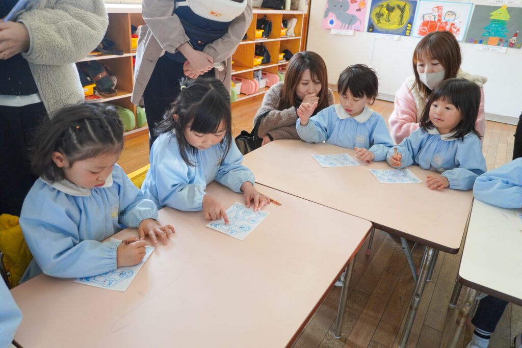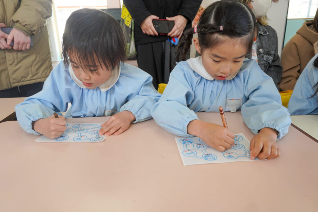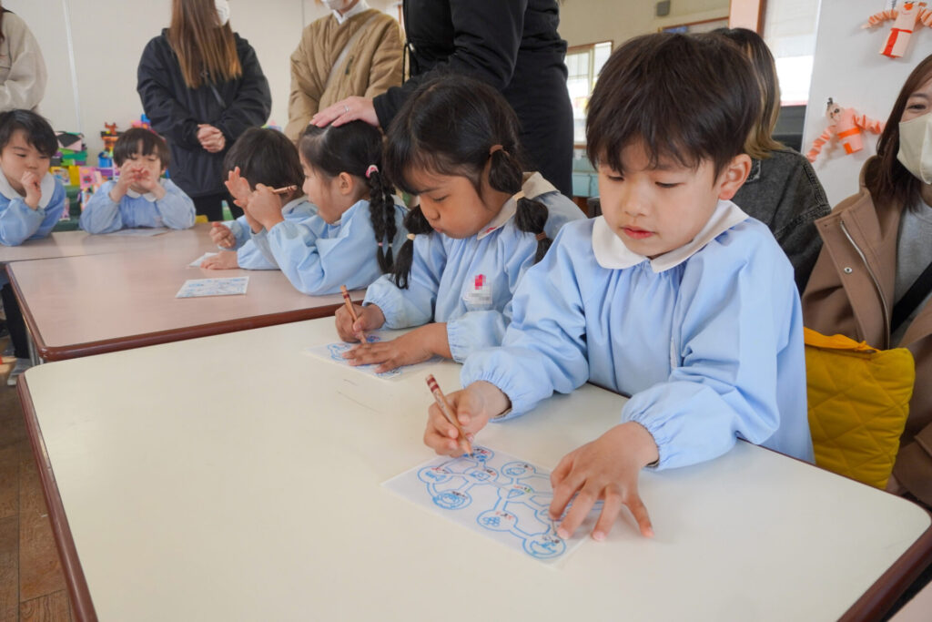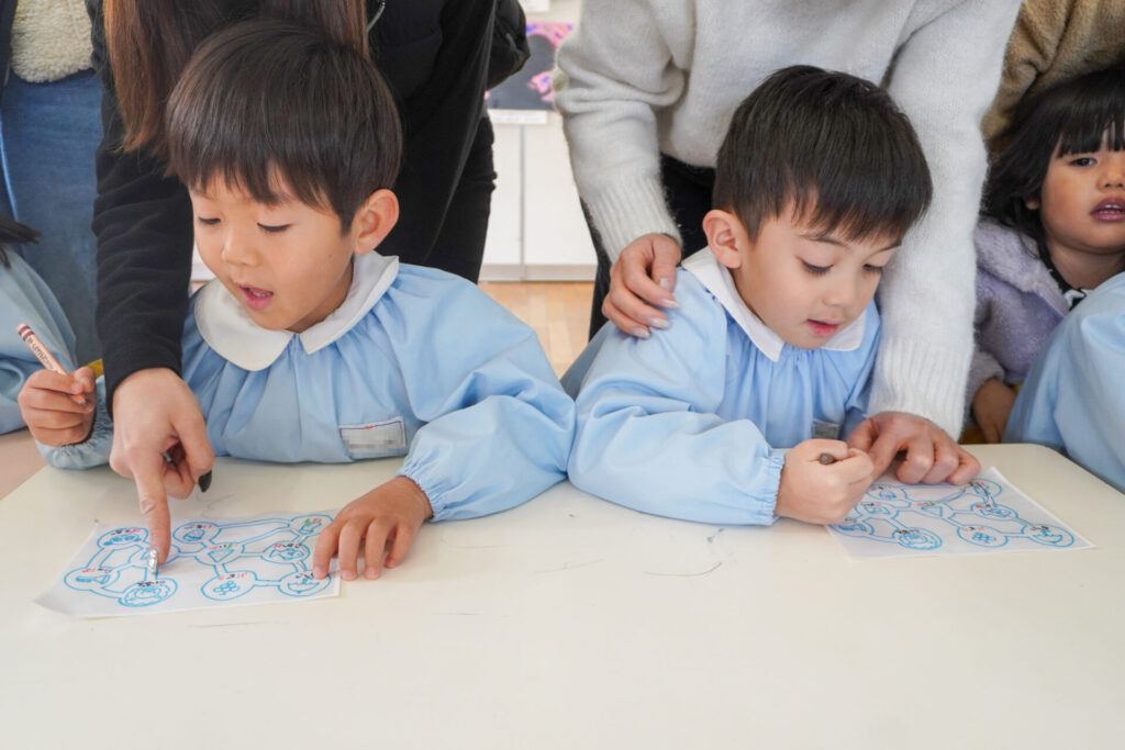 教材の「線のワーク」を通して、鉛筆を正しく持って濃く書ける子が増えてきました。線、丸、波線、点々、ぐるぐる、迷路…絵を見て書いたり、なぞったり、集中して取り組んでいる姿をたっぷりと見ていただきました。この経験が年長進級後の「書き方」のお稽古へつながることと思います。