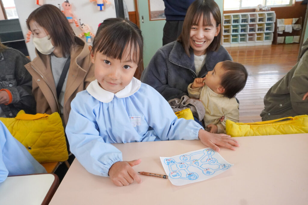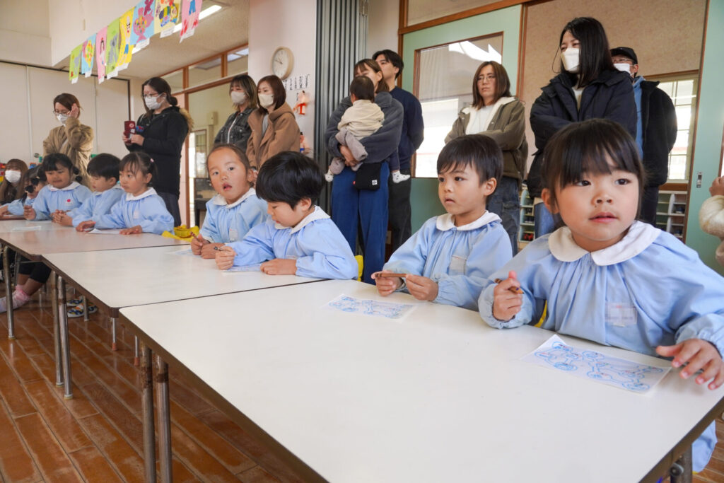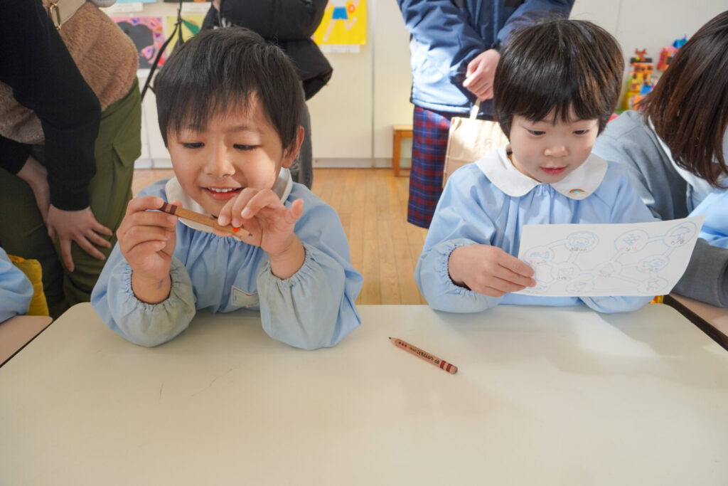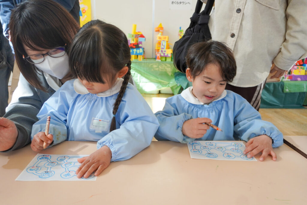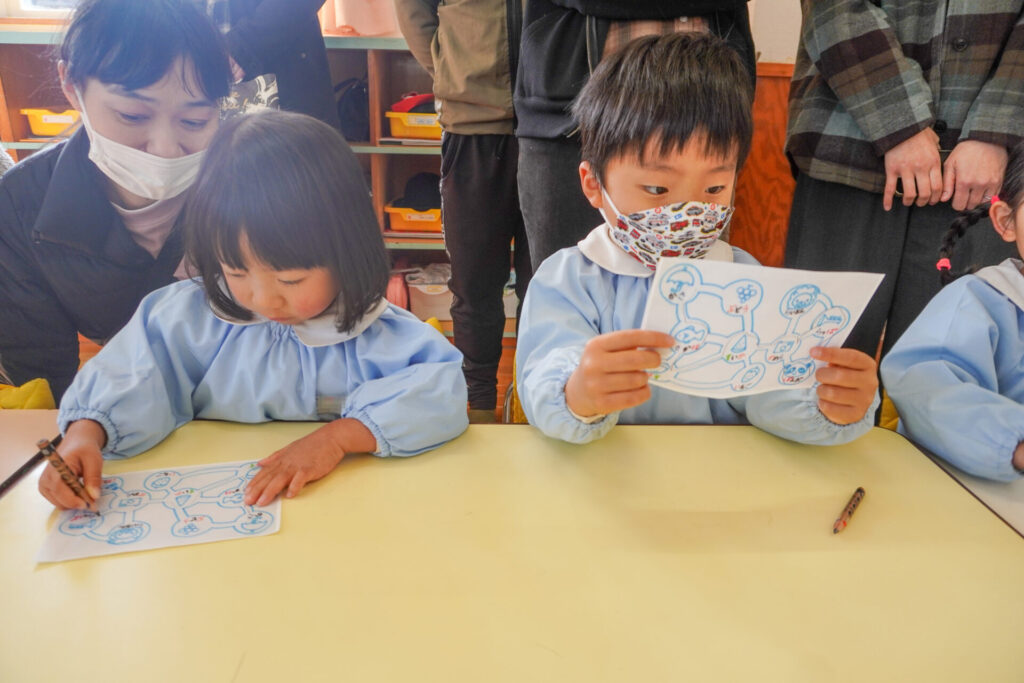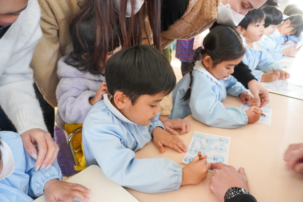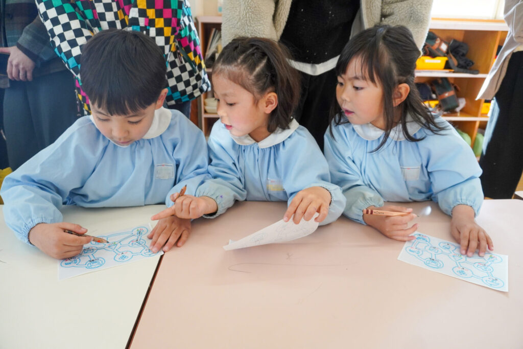 教材の「線のワーク」を通して、鉛筆を正しく持って濃く書ける子が増えてきました。線、丸、波線、点々、ぐるぐる、迷路…絵を見て書いたり、なぞったり、集中して取り組んでいる姿をたっぷりと見ていただきました。この経験が年長進級後の「書き方」のお稽古へつながることと思います。