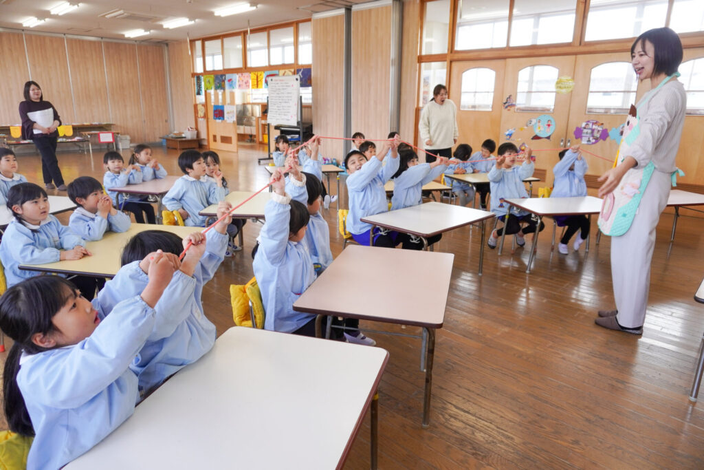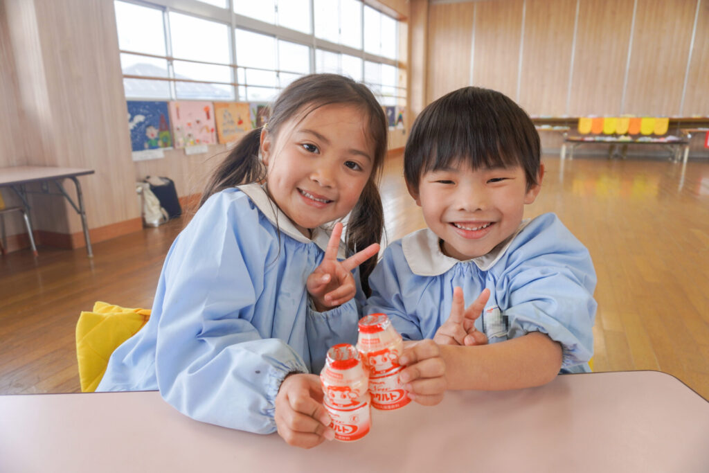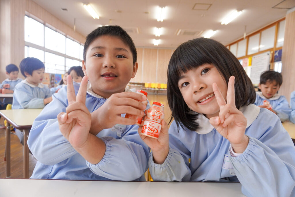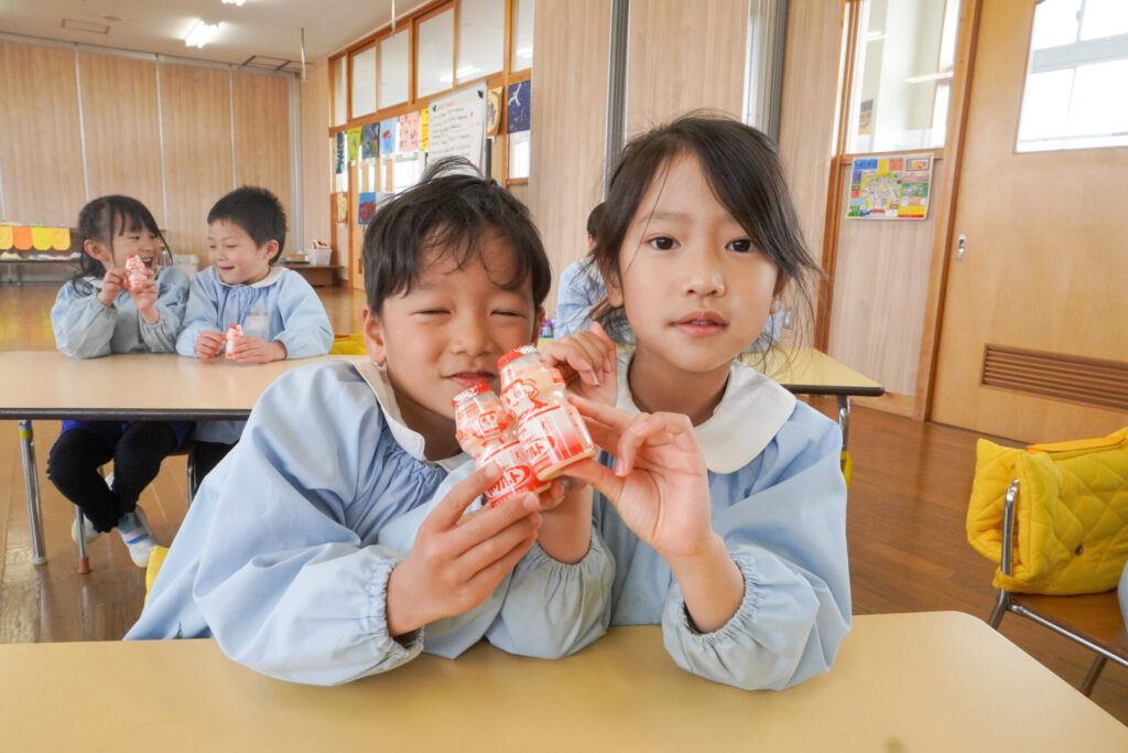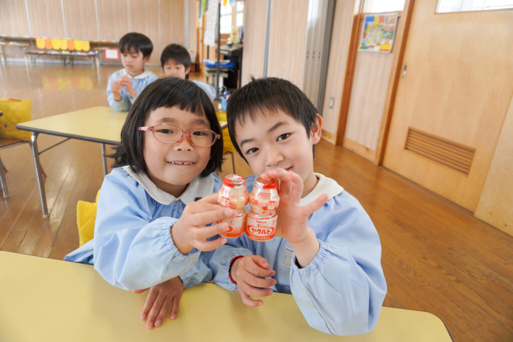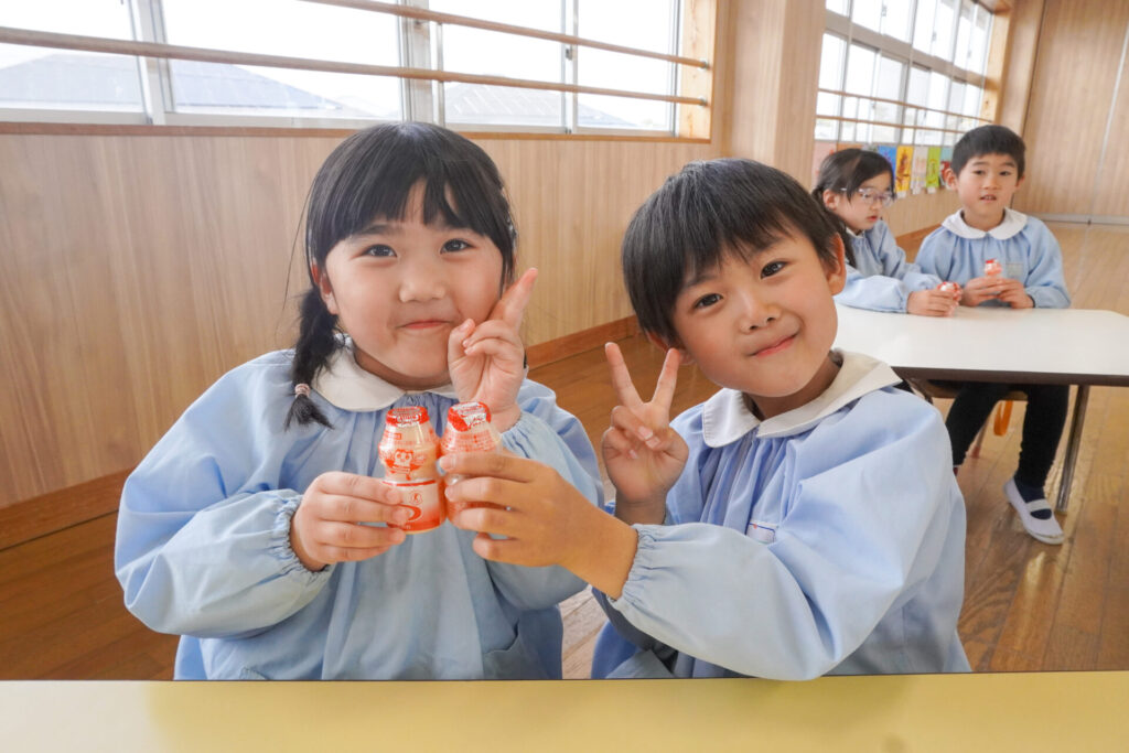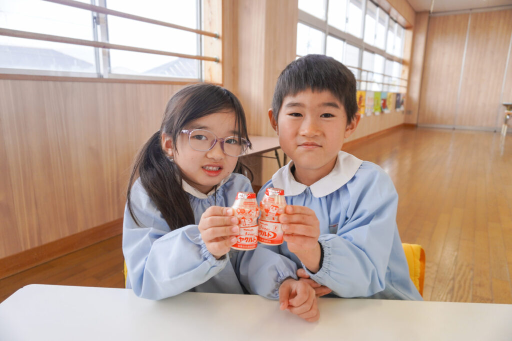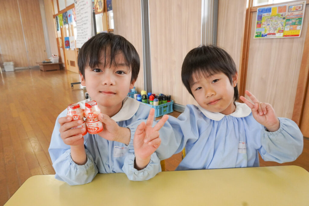 園での様子 ヤクルト健康教室(年長) madokahp 2026年2月17日 今日は、ヤクルト様より講師をお招きし、年長つき組対象に「ヤクルト健康教室」を行いました。エプロンシアターでは、体の中がどうなっているか、口にした食べ物はどのように体内に入っていくのか、分かりやすく教えていただき、胃を通って、小腸、大腸を通って「うんち」になることが分かりました。 「小腸の」を長さを実際に持ってみると、何と、園児8~9名程になり、「えーっ!長い!!」と、驚きと発見の連続でした。 紙芝居では「いい菌」と「わるい菌」の話もありました。手洗いをすることの大切さが再確認できました。 そして、8つのお約束です。子どもたちと一緒に振りをつけながら覚えました。①早寝「すやすや」 ➁早起き「パチパチ」 ③うんち「ぷりぷり」 ④朝ごはん「モリモリ」 ⑤お野菜「モグモグ」 ⑥体「のびのび」 ⑦お水「ごくごく」 ⑧いい菌「ぐびぐび」この8つを守って生活をすることを約束しました。 そして、今日は特別にいただいた「ヤクルト」をみんなで飲みました。「おいしい!」と言って、元気100倍です!まだまだ寒い日が続きますが、残り少ない園生活、毎日元気に登園してください。