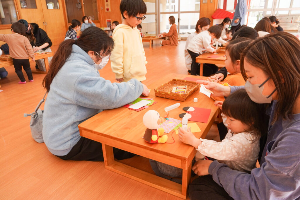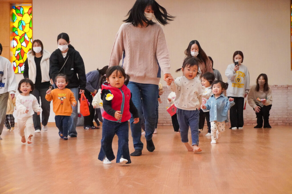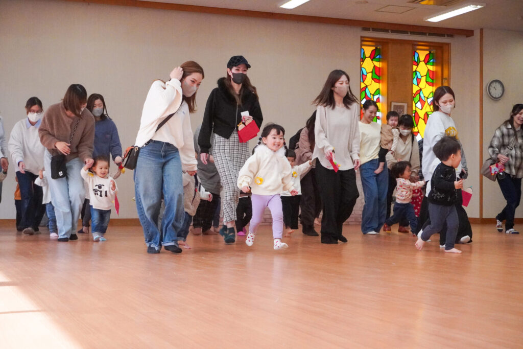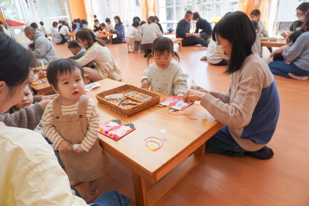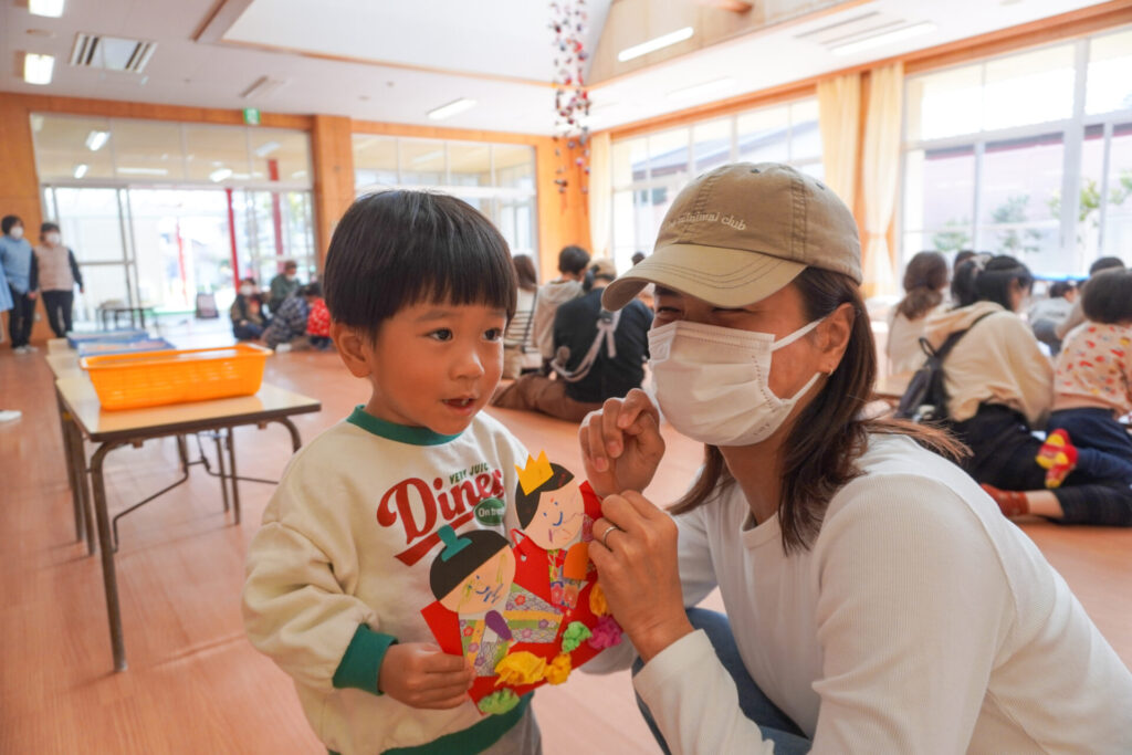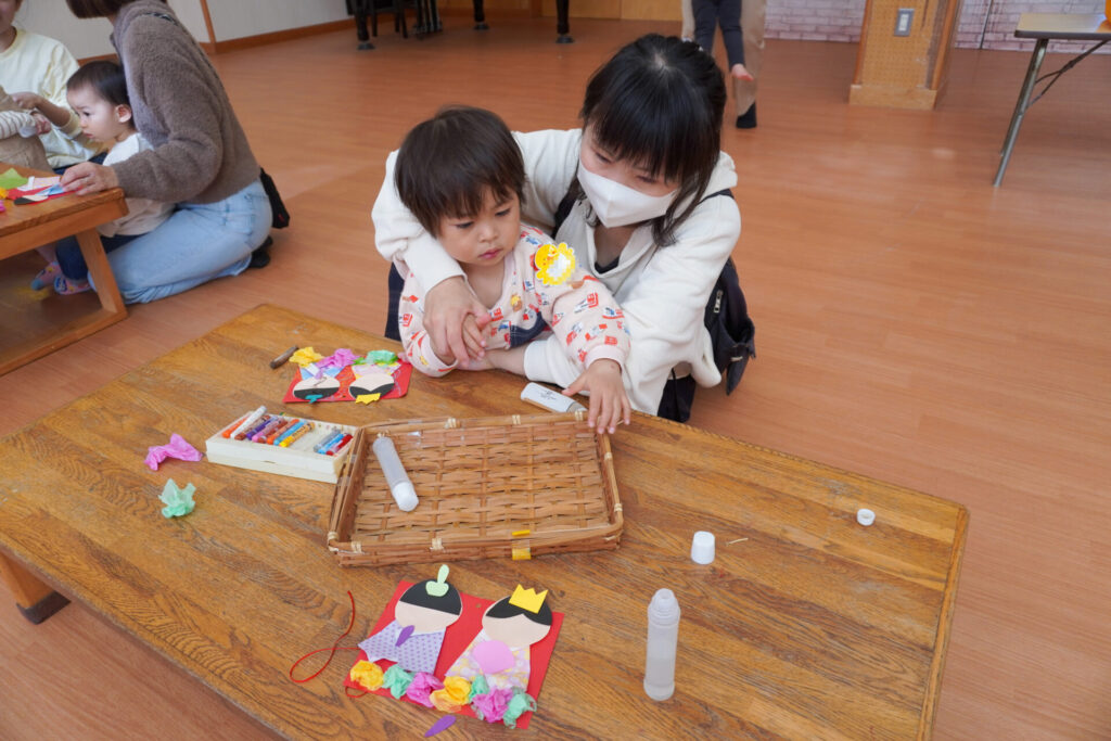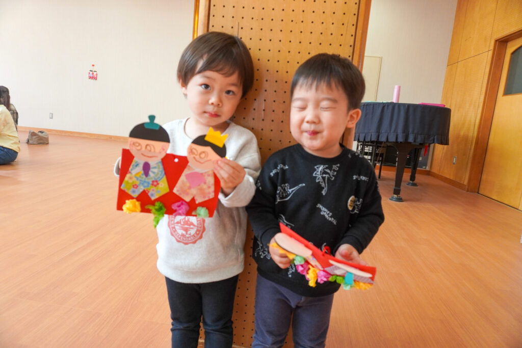 未就園児 ひな飾り作り(にこぴよちゃん) madokahp 2026年2月24日 ♪あかりをつけましょ ぼんぼりに~ ホールにひなまつりの音楽が流れています。今日の「にこぴよちゃん」は親子で「ひな飾り作り」を行いました。描いたり、貼ったりしながら、とてもかわいらしい「おだいりさま」と「おひなさま」が完成しました。 2人並んだかわいらしい「ひな飾り」に、にこぴよちゃんの益々の健康を願わずにはいられません。これからもよく遊んでよく食べて、すくすく大きくなってくださいね。 手遊びやダンスも大好きで、「エビカニクス」の音楽が流れると、楽しく体を動かす姿が見られ、嬉しく思いました。今日のお土産は「絵本」でした。大事に手に取っていた姿がとてもかわいらしかったです。暦の上ではもう春です。ぽかぽか暖かい春が待ち遠しいですね。 次回は来週3/3(火)10:00~「にこぴよちゃん おしまいの会」です。年少ゆり組・ばら組がにこぴよちゃんの前でお楽しみの発表をする予定です。初めての方、大歓迎です!ぜひ遊びに来てください!