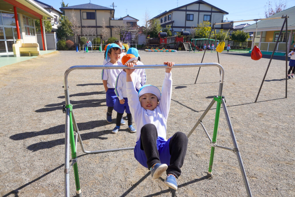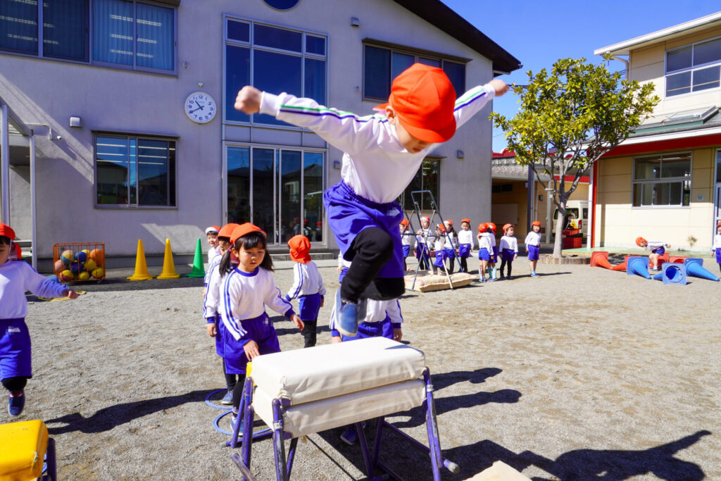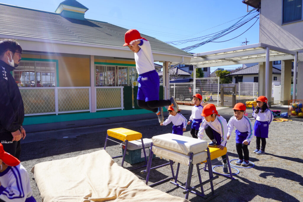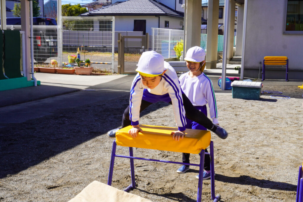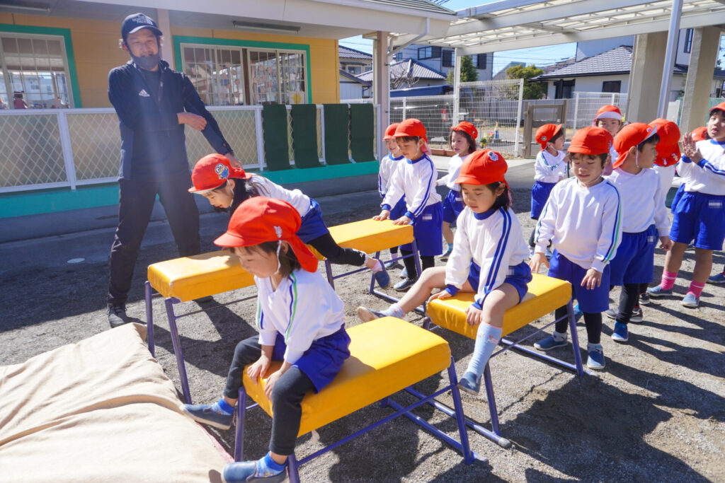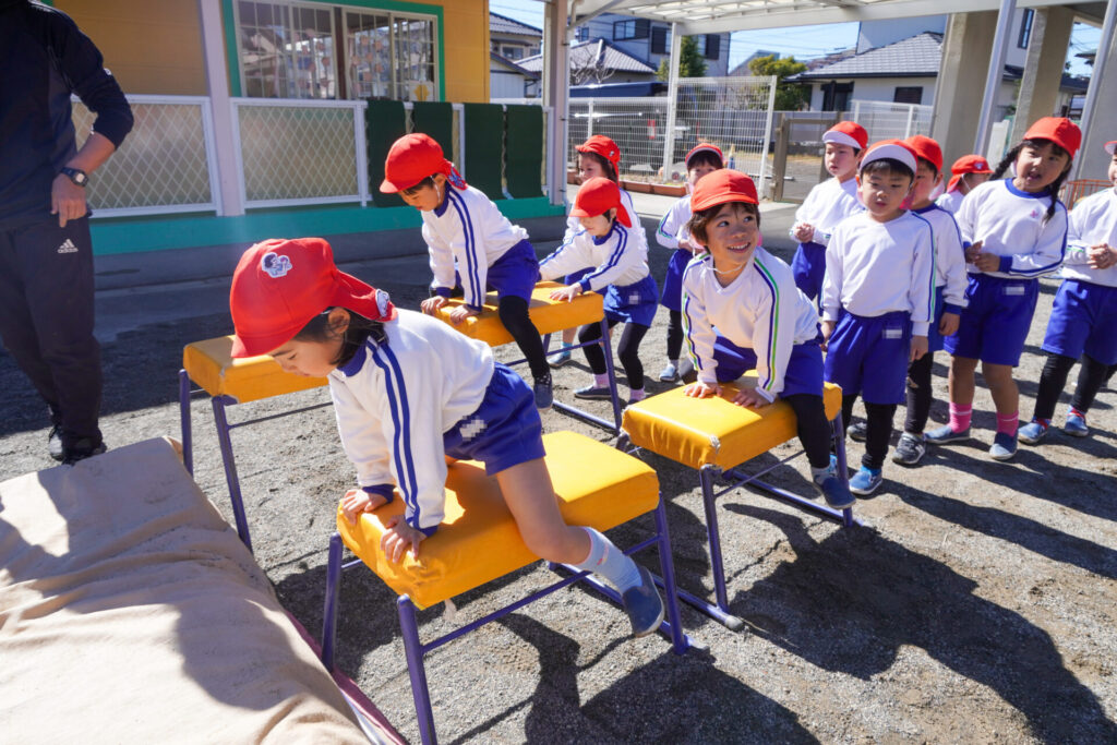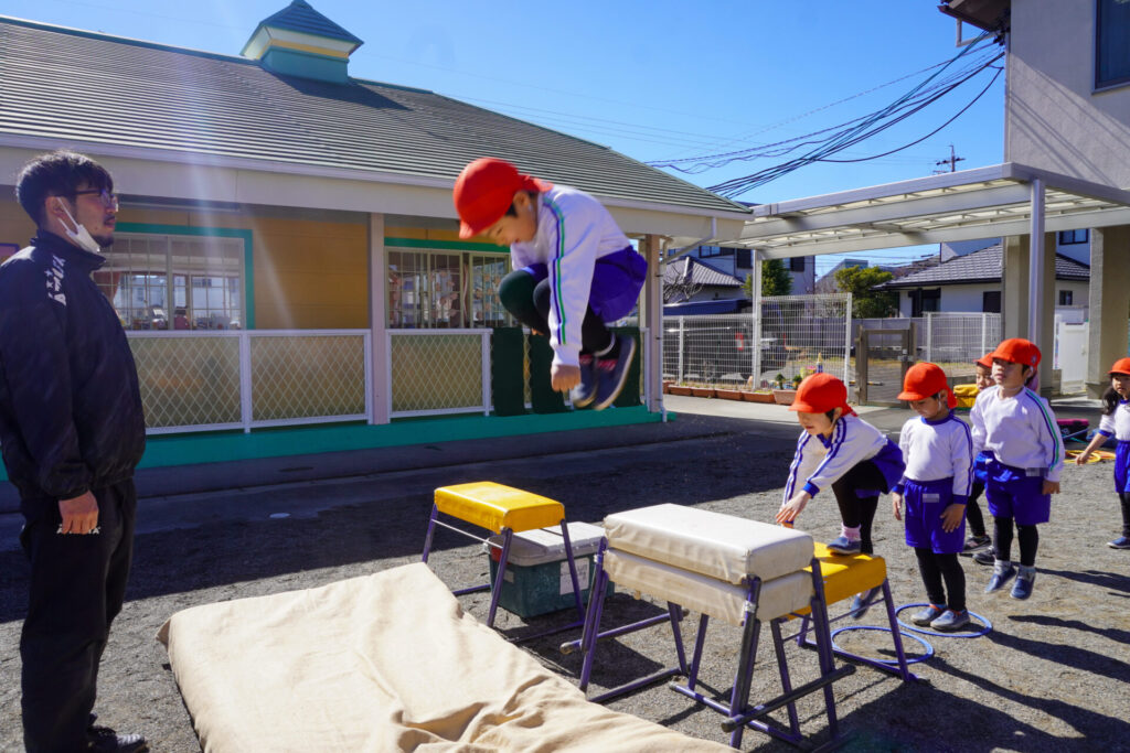 園での様子 体育遊び(講師保育) madokahp 2026年2月26日 今日は課外教室講師のスマイルキッズ・大村哲平先生による「体育遊び」を行いました。 年少ゆり組・ばら組は、集団での約束を守れるようになりました。ボール集め競争では、1個でも多く集められるよう、あっという間にたくさんのボールをマットへ集めることができました。 器具のサーキット遊びでは、吊り輪、跳び箱ジャンプ、マットゴロゴロ、パンチング、鉄棒ぶら下がりのトレーニングを回転よくできました。 年中さくら組は、逆上がりができる子が増え、諦めずに挑戦することが増えてきました。跳び箱、マットの前転など、スピーディーにきれいに器具遊びができました。ペアの友だちとのボール遊びでは、キャッチしたり、投げたり、パンチ落としをしたり、遊びのルールをすぐに理解して取り組めました。 年長つき組は、園生活の集大成に近づいてきました。跳び箱は自分の跳べる高さ、跳んでみたい高さを選んで跳んだり、ボールのパンチングではパンチ力も強くなりました。 縄跳びも、後ろ回し、ケンケン跳び、あや跳びなど、多岐に渡りできる子が増えてきました。 今日は真っ青な空が広がり、クラス帽子もきれいに映えていました。園庭で元気に「体育遊び」へ参加できて楽しかったですね。明日も幼稚園で元気いっぱい遊びましょうね。