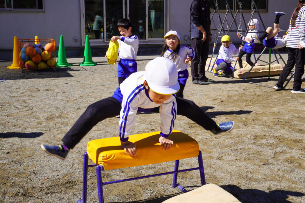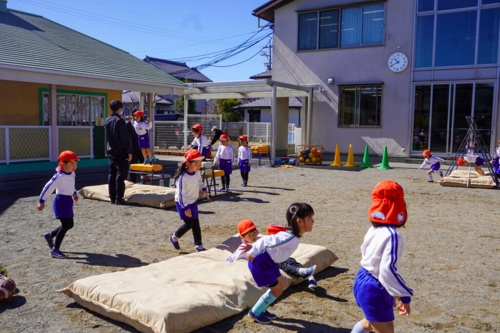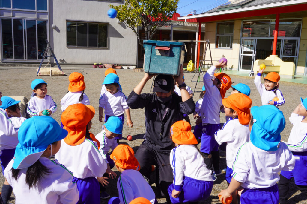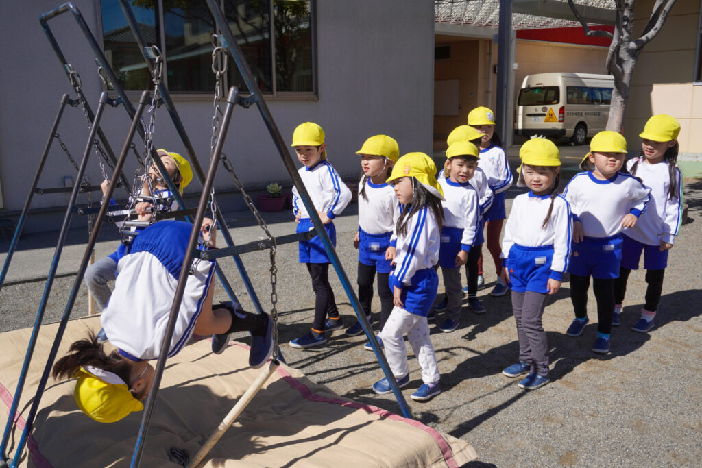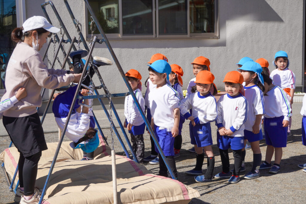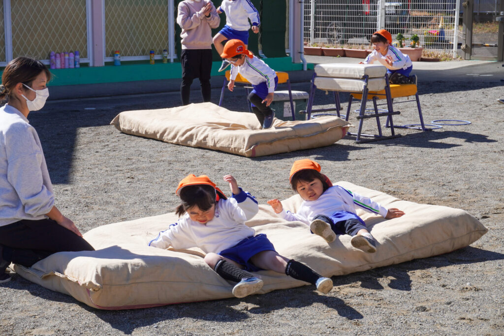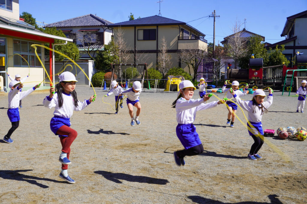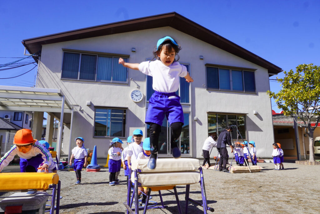 園での様子 体育遊び(講師保育) madokahp 2026年2月26日 今日は課外教室講師のスマイルキッズ・大村哲平先生による「体育遊び」を行いました。 年少ゆり組・ばら組は、集団での約束を守れるようになりました。ボール集め競争では、1個でも多く集められるよう、あっという間にたくさんのボールをマットへ集めることができました。 器具のサーキット遊びでは、吊り輪、跳び箱ジャンプ、マットゴロゴロ、パンチング、鉄棒ぶら下がりのトレーニングを回転よくできました。 年中さくら組は、逆上がりができる子が増え、諦めずに挑戦することが増えてきました。跳び箱、マットの前転など、スピーディーにきれいに器具遊びができました。ペアの友だちとのボール遊びでは、キャッチしたり、投げたり、パンチ落としをしたり、遊びのルールをすぐに理解して取り組めました。 年長つき組は、園生活の集大成に近づいてきました。跳び箱は自分の跳べる高さ、跳んでみたい高さを選んで跳んだり、ボールのパンチングではパンチ力も強くなりました。 縄跳びも、後ろ回し、ケンケン跳び、あや跳びなど、多岐に渡りできる子が増えてきました。 今日は真っ青な空が広がり、クラス帽子もきれいに映えていました。園庭で元気に「体育遊び」へ参加できて楽しかったですね。明日も幼稚園で元気いっぱい遊びましょうね。