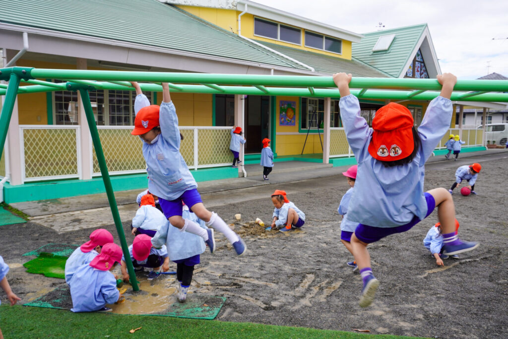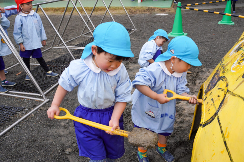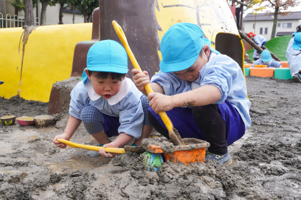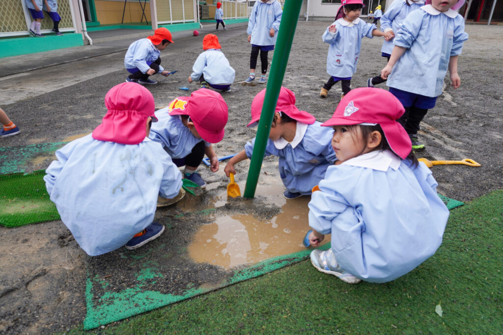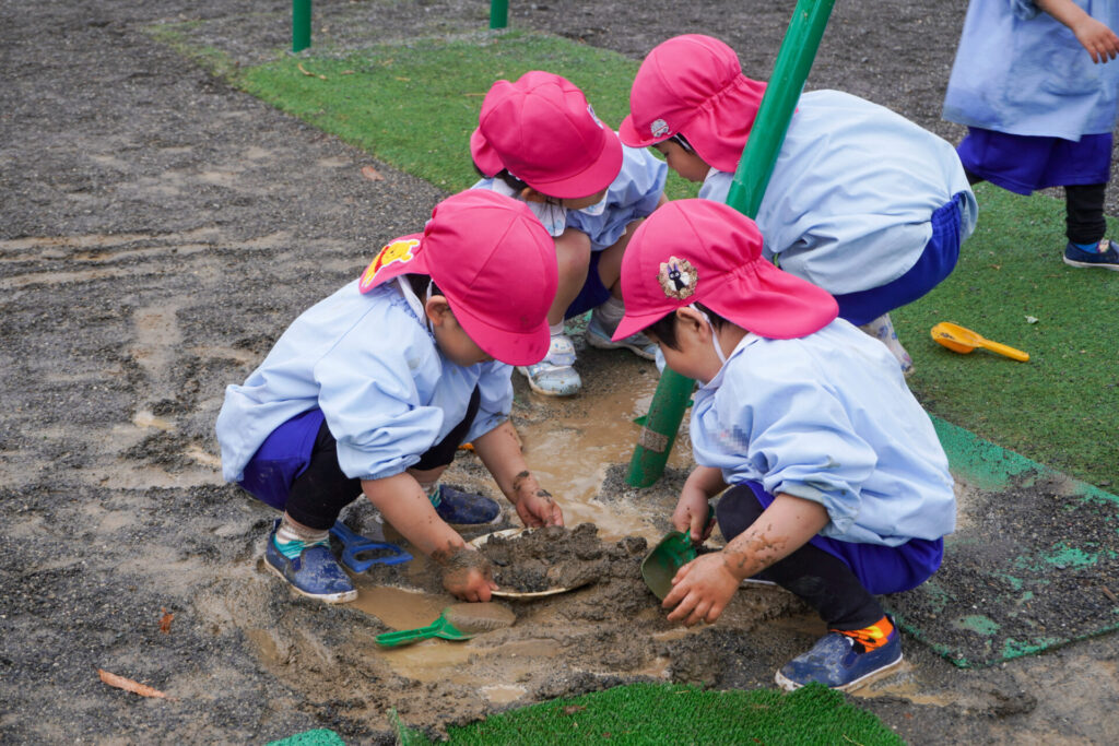 まどかっこは戸外遊びが大好きです。昨日の雨が上がり、今日は戸外で元気いっぱい遊びました。雨上がりにできる水たまり、その柔らかい土を見逃しません。すぐにスコップを持ってきて、ショベルカーのようにすくって遊び始めました。「一緒にやろう!」と次々に加わります。