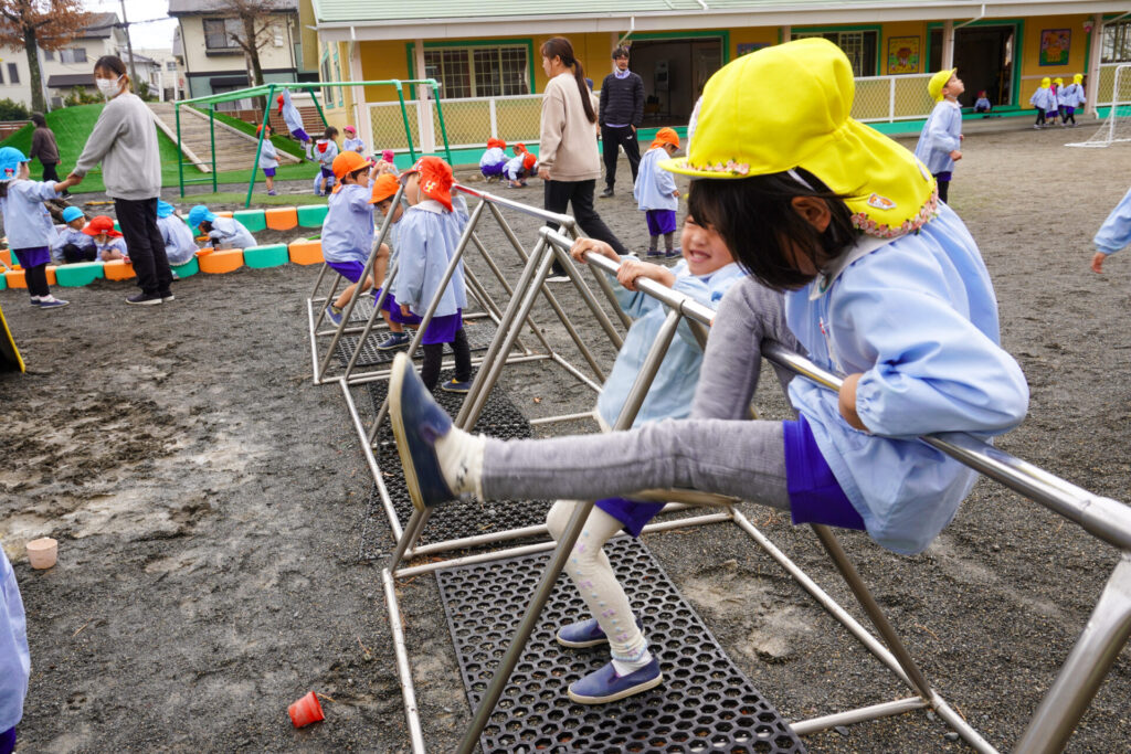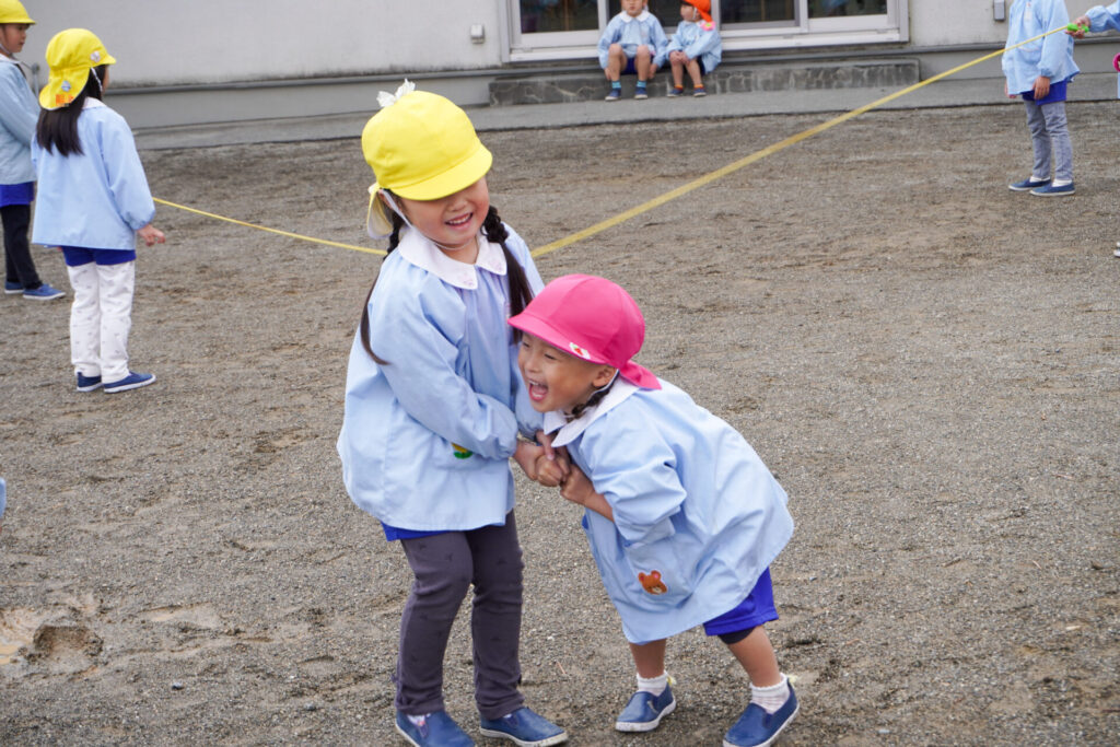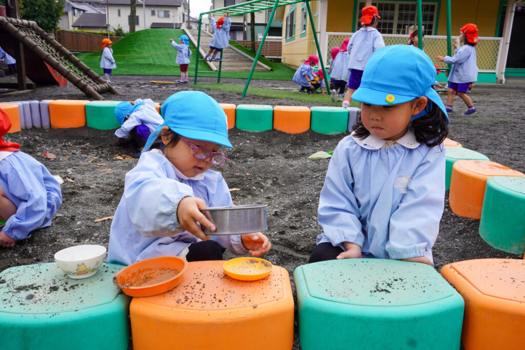 うんていや鉄棒の逆上がり…できることが増えてきて、自信もついてきました。砂場遊びも大好きです。お椀とふるいを使ってのサラ粉作りが上手になり、夢中になって遊んでいます。
