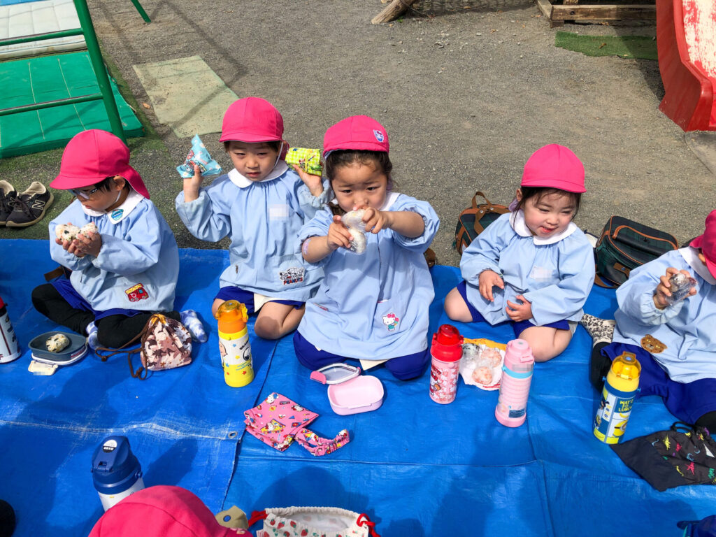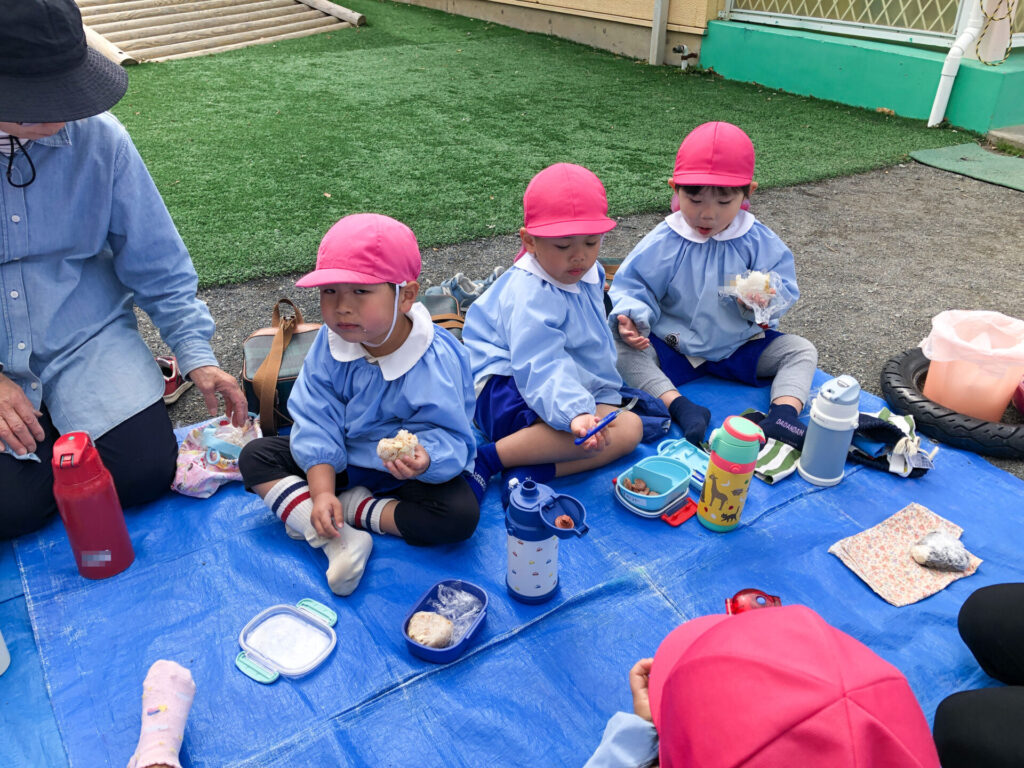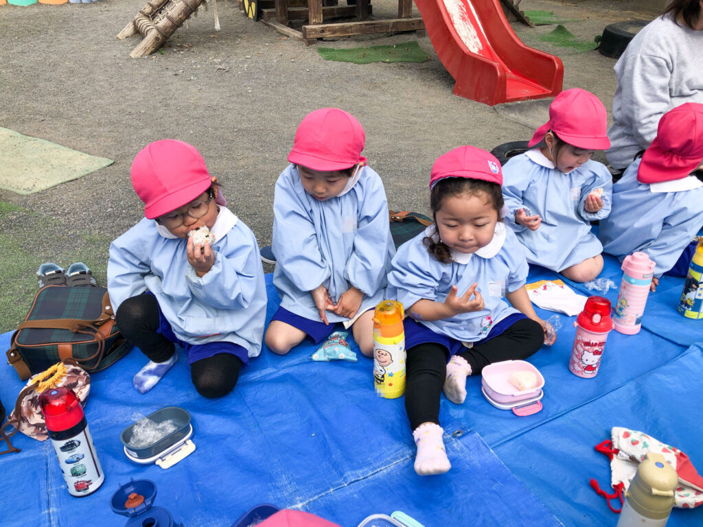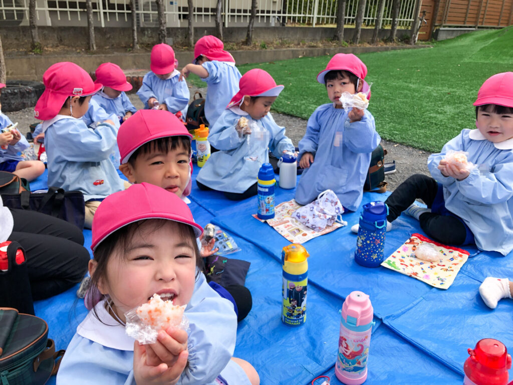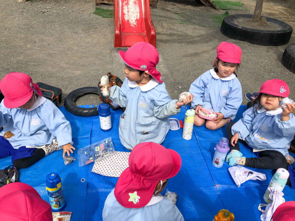 たくさん遊んだ後は園庭の築山で「ピクニック」です。今日の昼食は「おにぎり」です。たくさん遊んで食も進みます。「おいしいね」「そうだね」と、会話も弾みます。とても楽しいピクニックになりましたね。