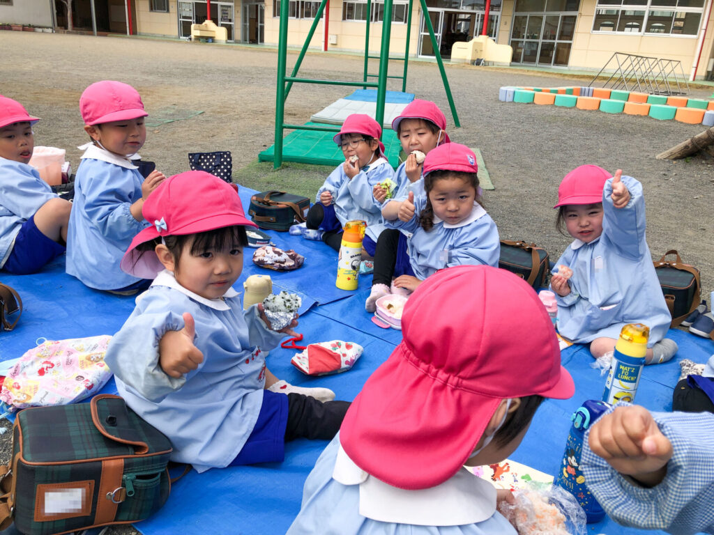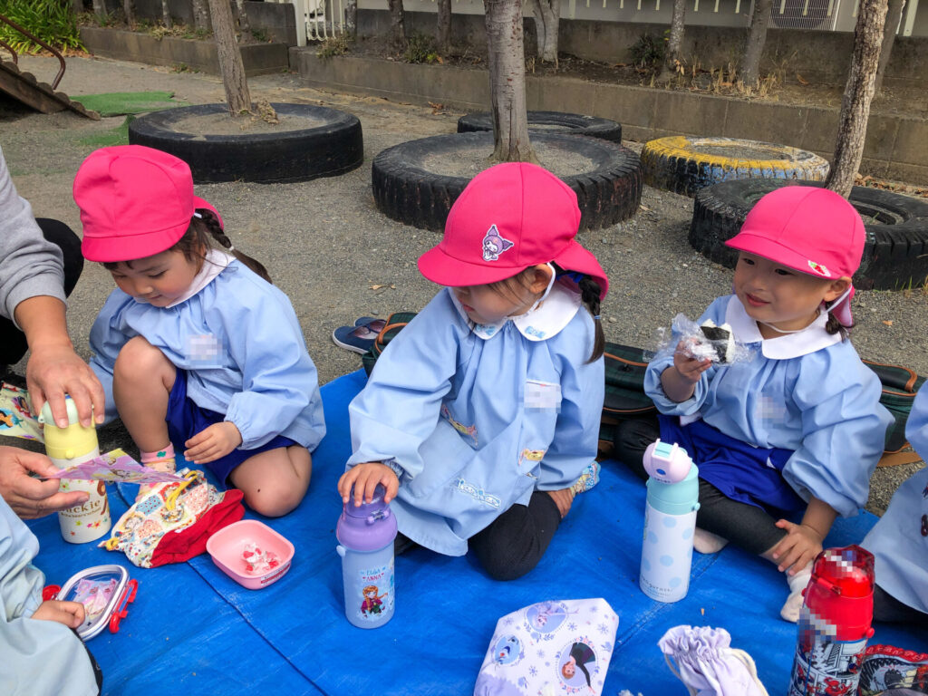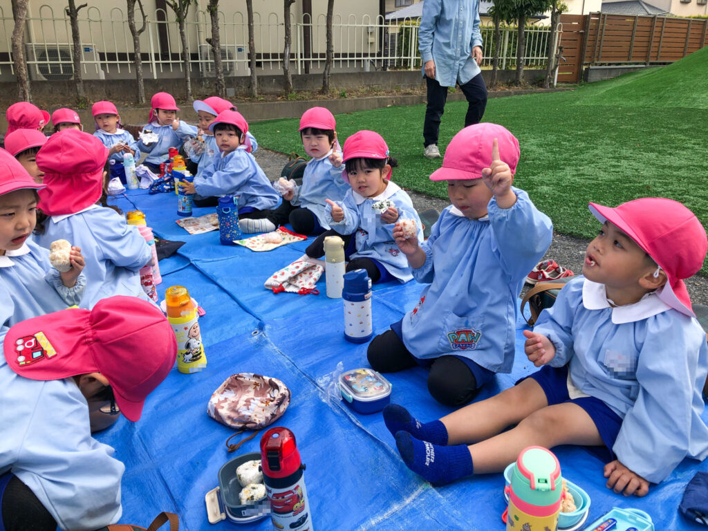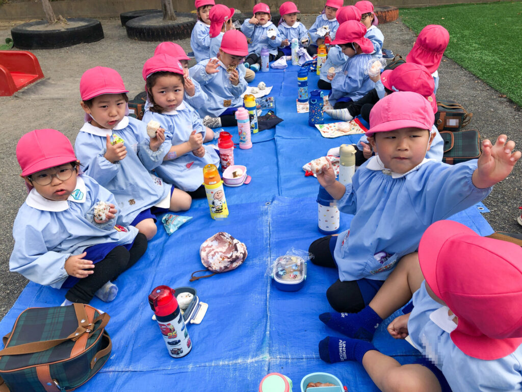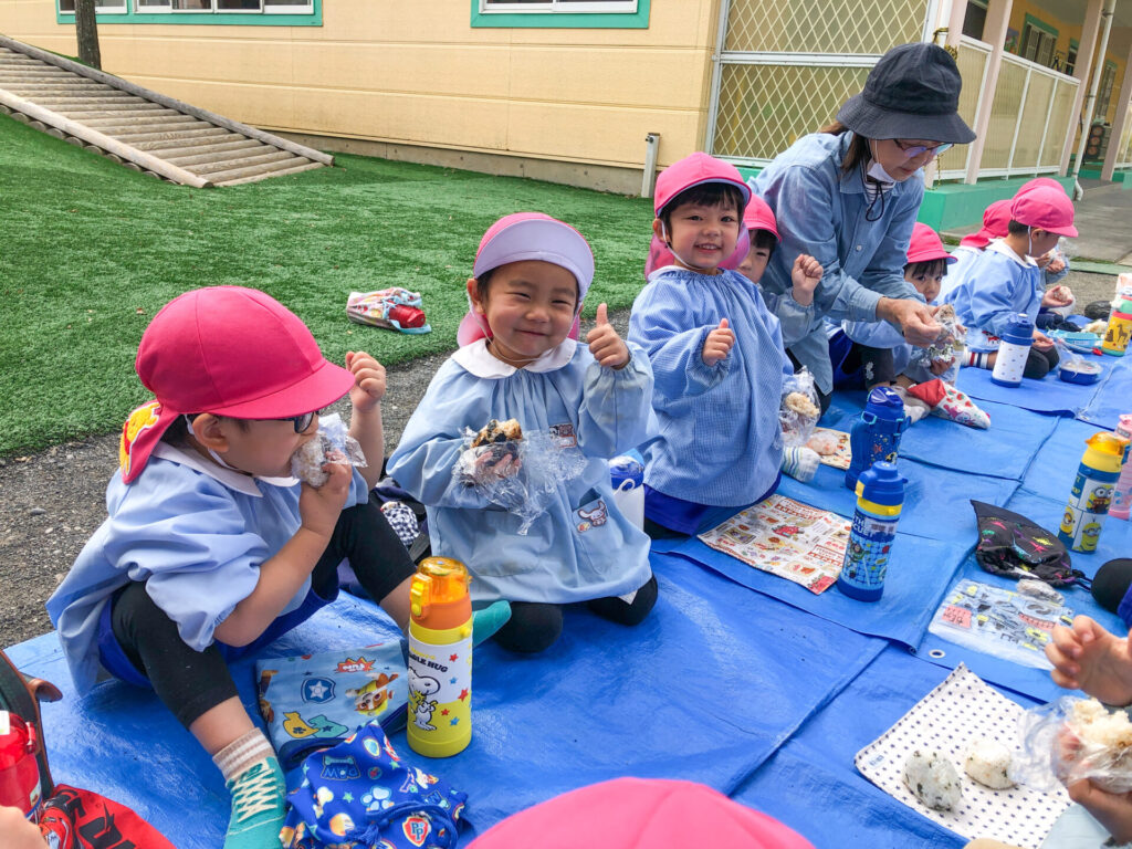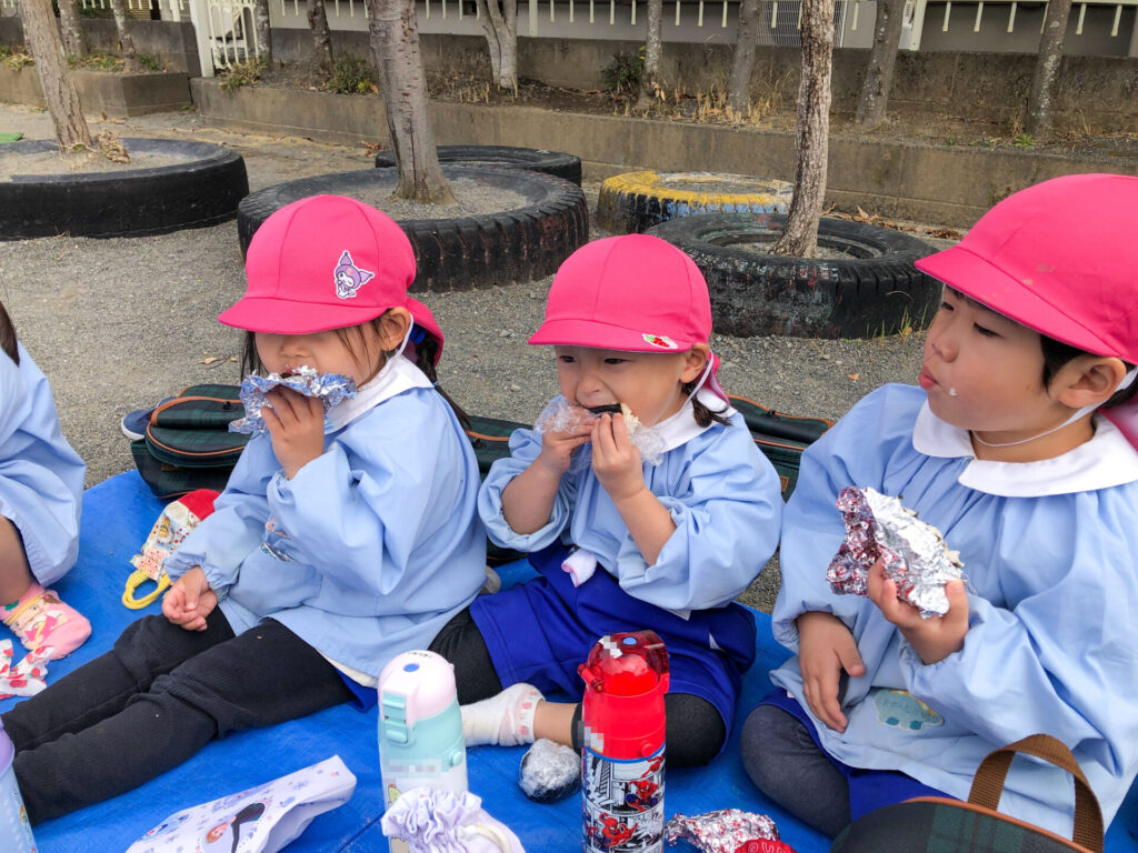たくさん遊んだ後は園庭の築山で「ピクニック」です。今日の昼食は「おにぎり」です。たくさん遊んで食も進みます。「おいしいね」「そうだね」と、会話も弾みます。とても楽しいピクニックになりましたね。