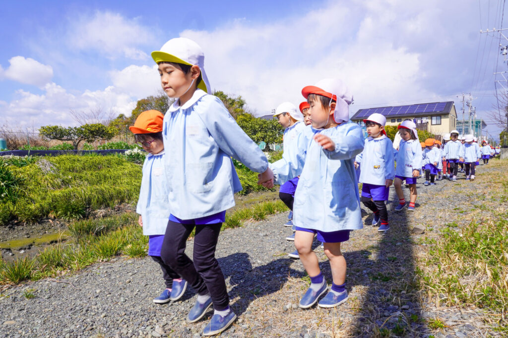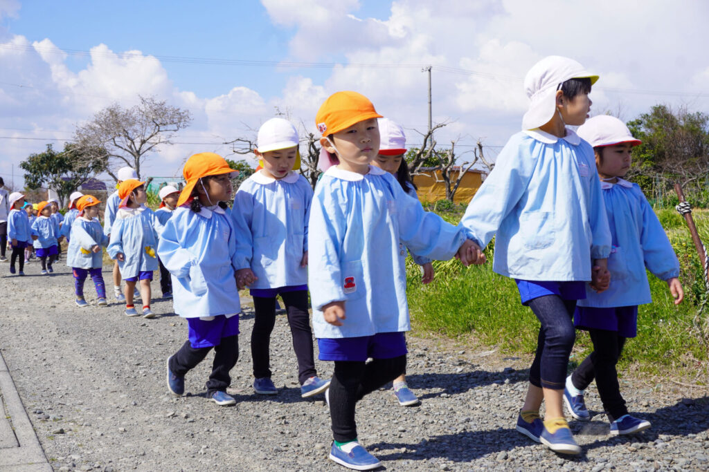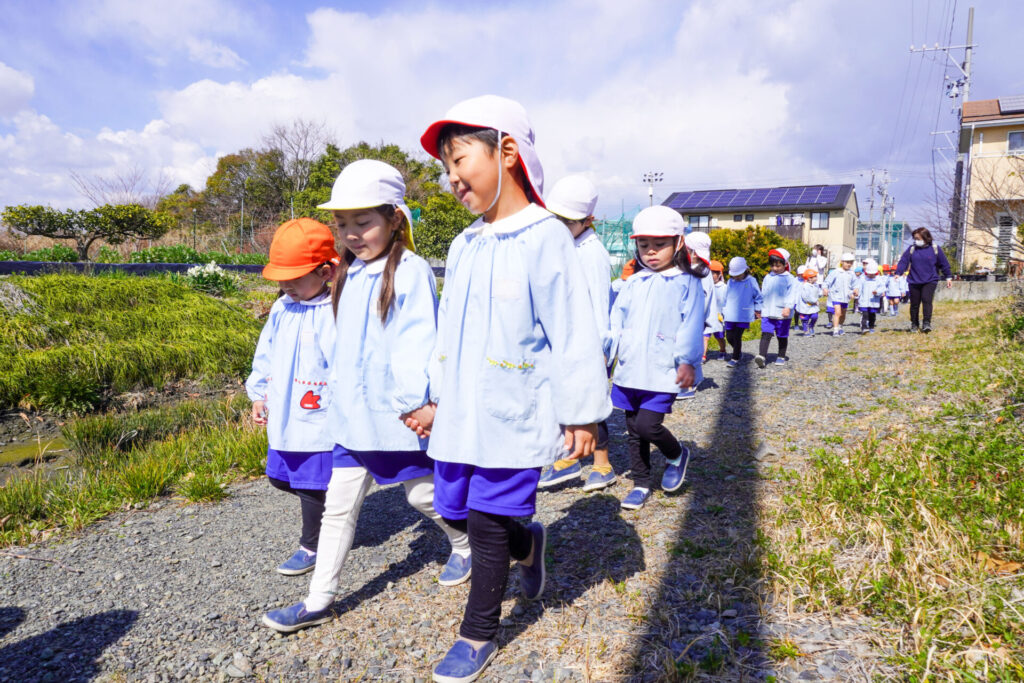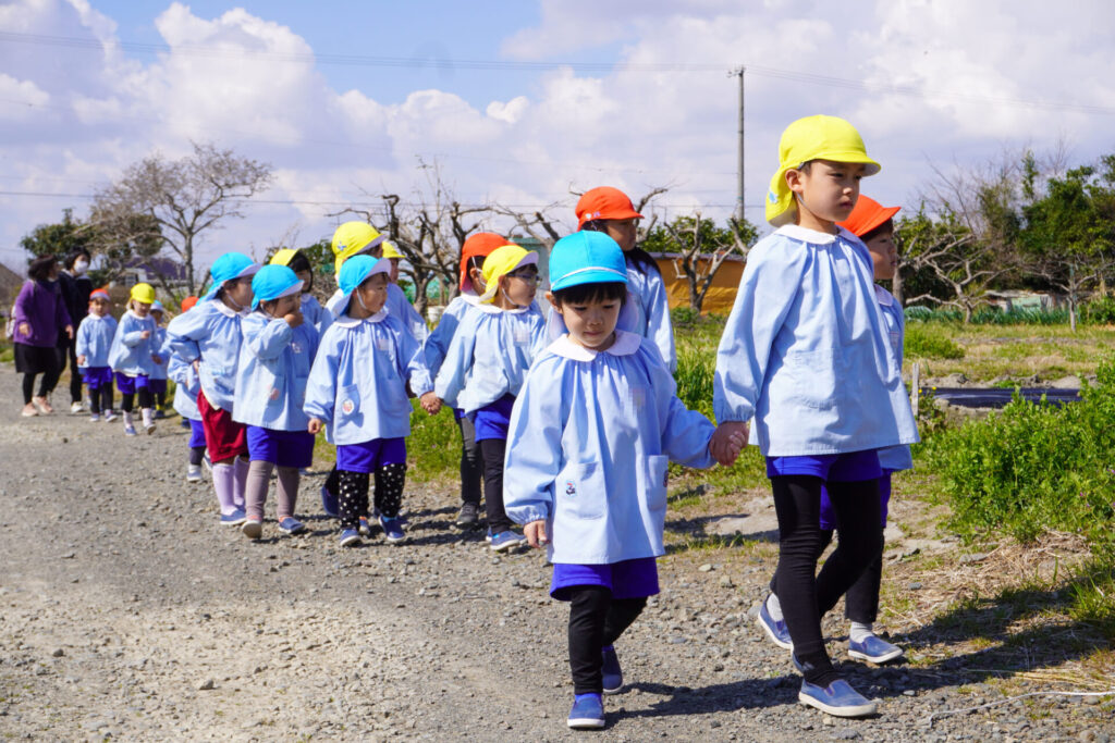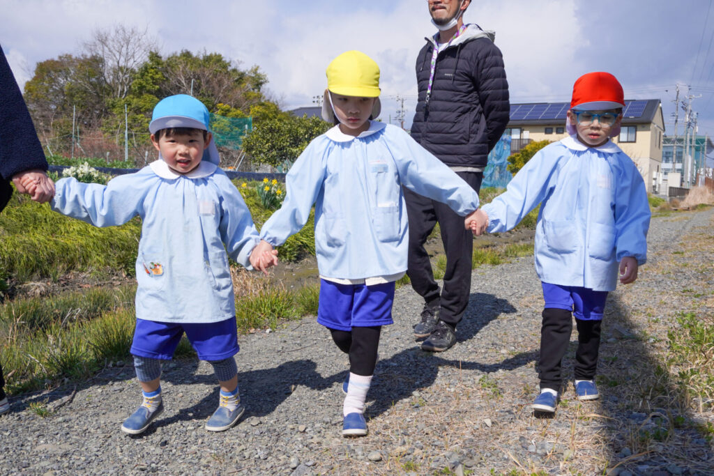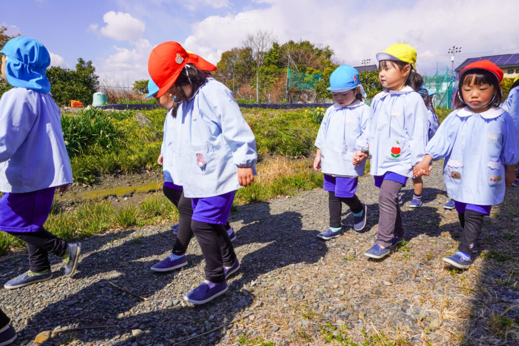 園での様子 ハイク~春探し~ madokahp 2026年3月10日 年長つき組・年中さくら組・年少ゆり組・ばら組で園近くへハイクへ行きました。今日は「春探しのハイク」です。「いちまるグランド」では、藤枝MYFCの選手が練習中でした。「頑張ってー!」と、大きな声で応援しました。 道中には「春」が少しずつ顔を出し始めました。まどかっこを歓迎してくれたかのように、「つくし」がたくさん顔を出していました。ぽかぽか陽気に誘われて、まどかっこの笑顔も満開です! 卒園・進級まであと少し…今しかないかかわりを通して、年長つき組はひとつでも多くのすてきな思い出作りを、年中さくら組・年少ゆり組・ばら組は、進級への期待が膨らむことを願っています。明日も幼稚園でいっぱい遊びましょうね。