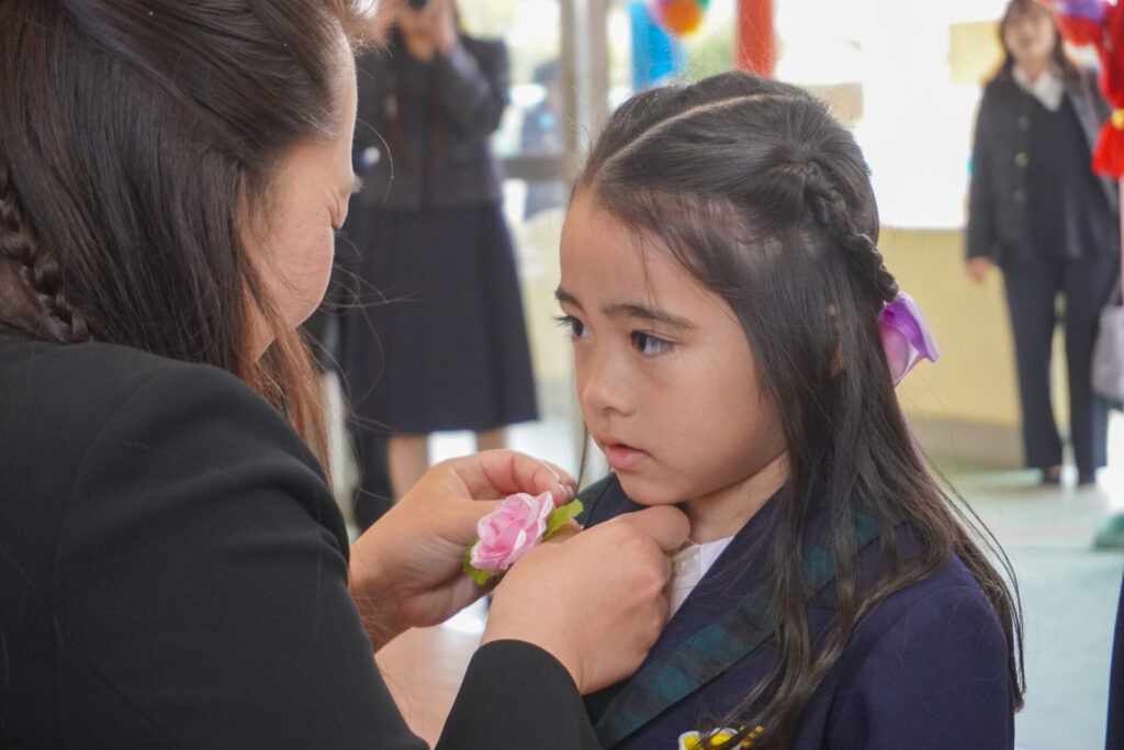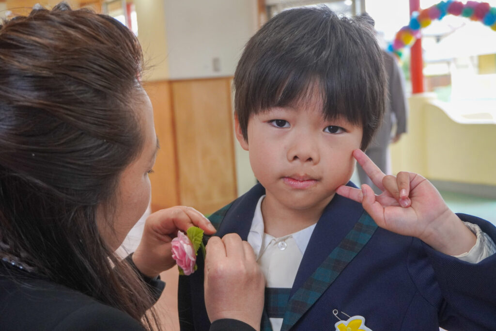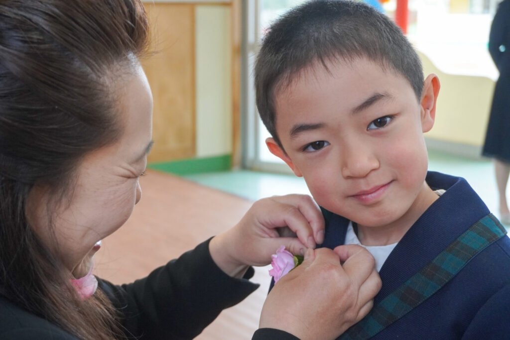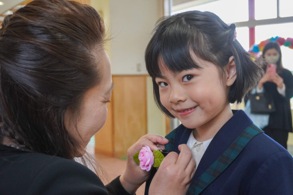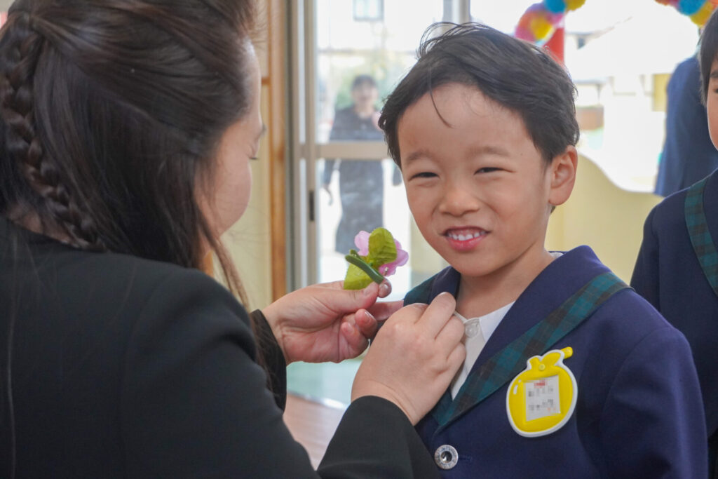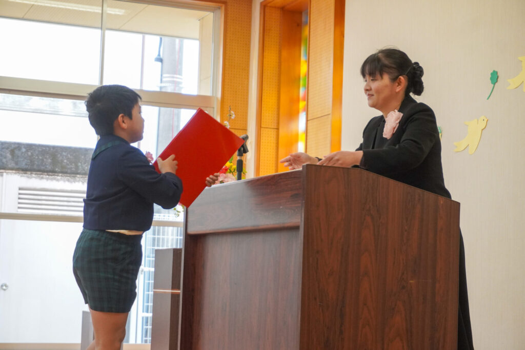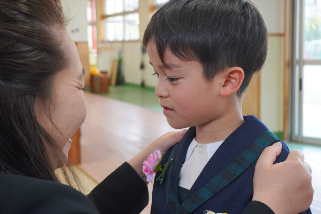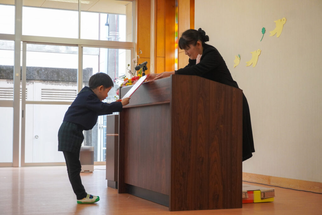 ボレロにお祝いのバラを付けてもらい、立派な姿で入場する子どもたちの様子から、大きな成長を感じました。また、保育修了証書授与では、「ありがとうございます」と一人ひとりがしっかりと受け取ることができました。歌の中には、これまで育ててくださったご家族への感謝の気持ちも込められており、心温まるひとときとなりました。