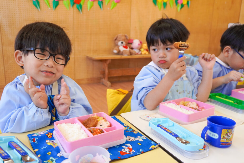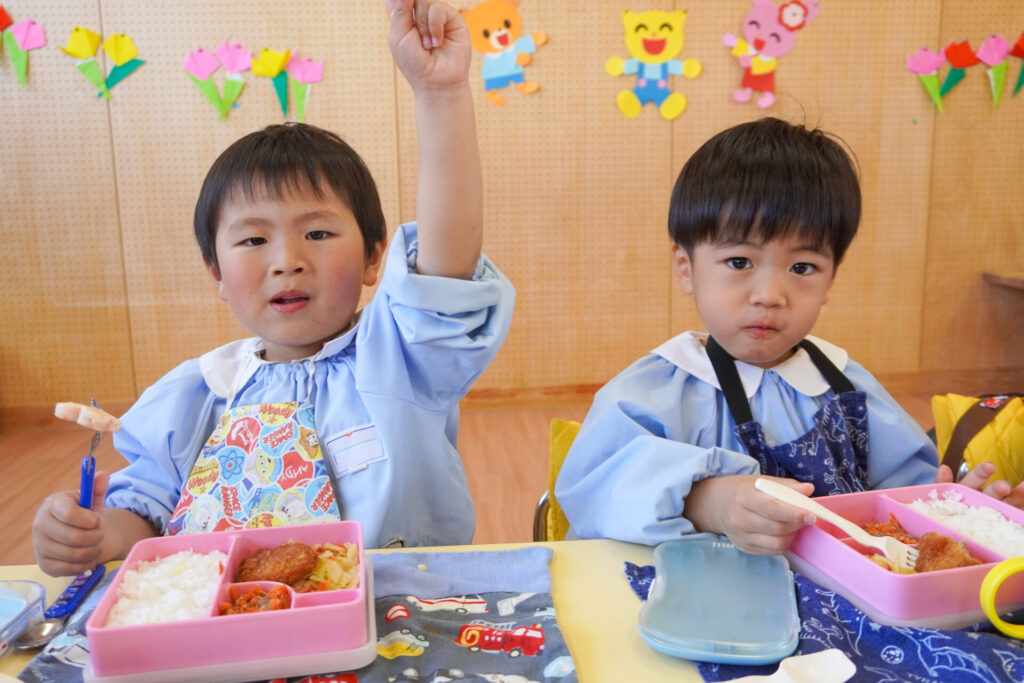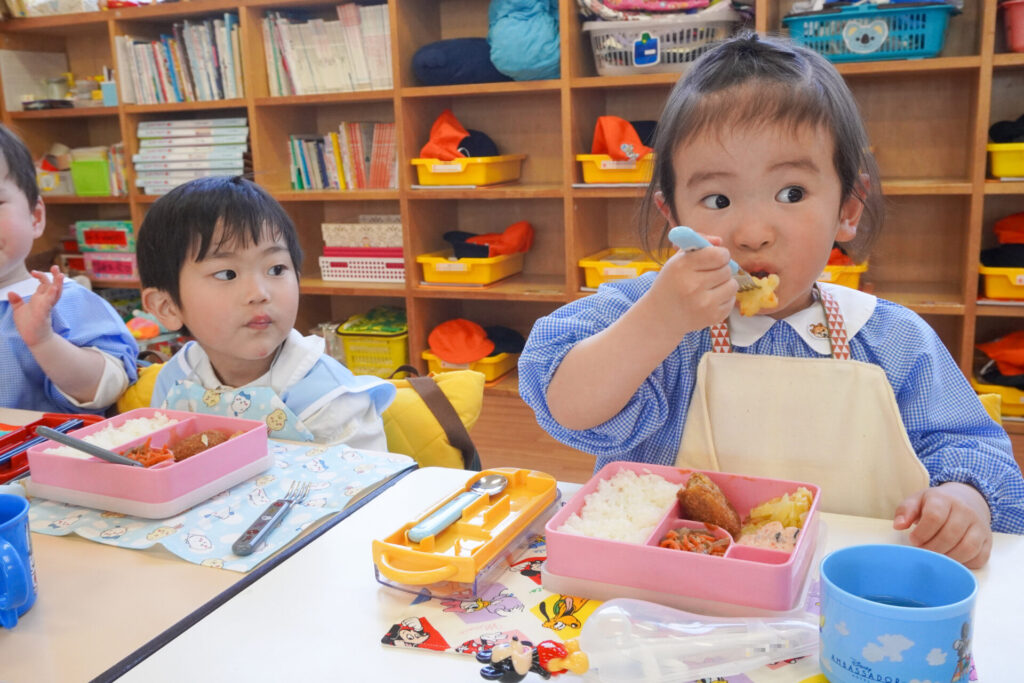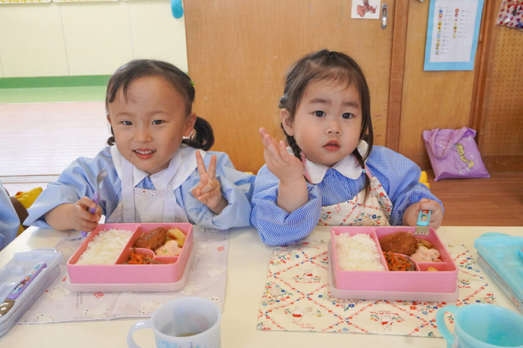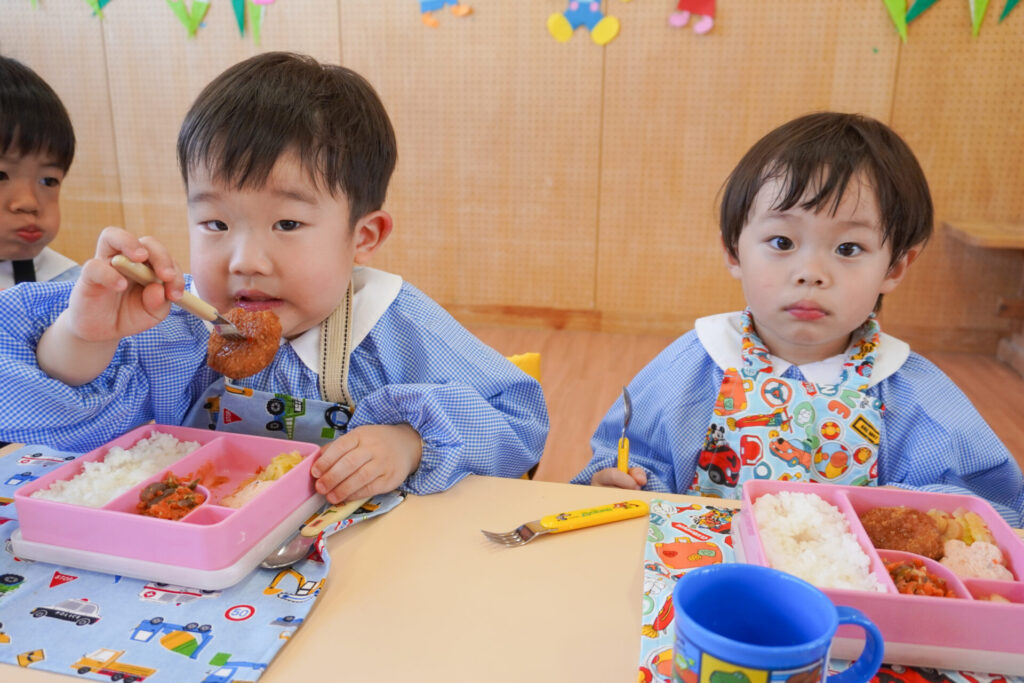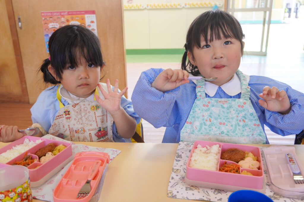 園での様子 給食(年少) madokahp 2026年4月14日 年少ゆり組・ばら組で食べる初めての「給食の日」でした。 食事の前には、排泄・手洗いをします。手を洗ったらハンカチで手を拭く、通園かばんから、給食セットを取り出して、ランチョンマットを広げる等、少しずつ流れを覚えていきます。 幼稚園で食べる「給食」はおしいですね。食事中は座って食べられるように励ましていきます。「早寝早起き朝ごはん」を合言葉に、規則正しい生活のもと、毎日元気に登園してくださいね。
