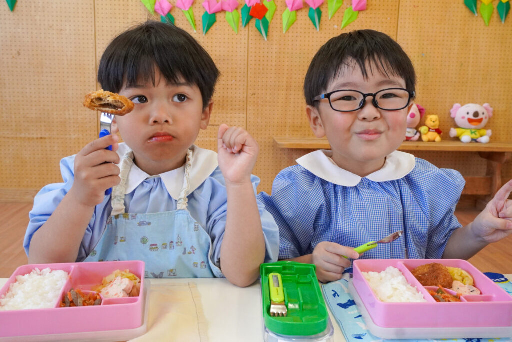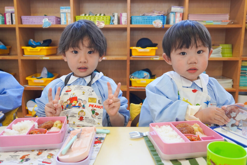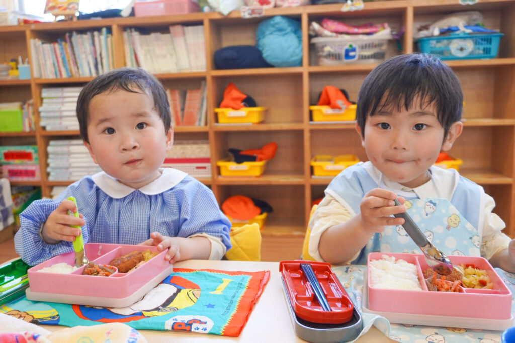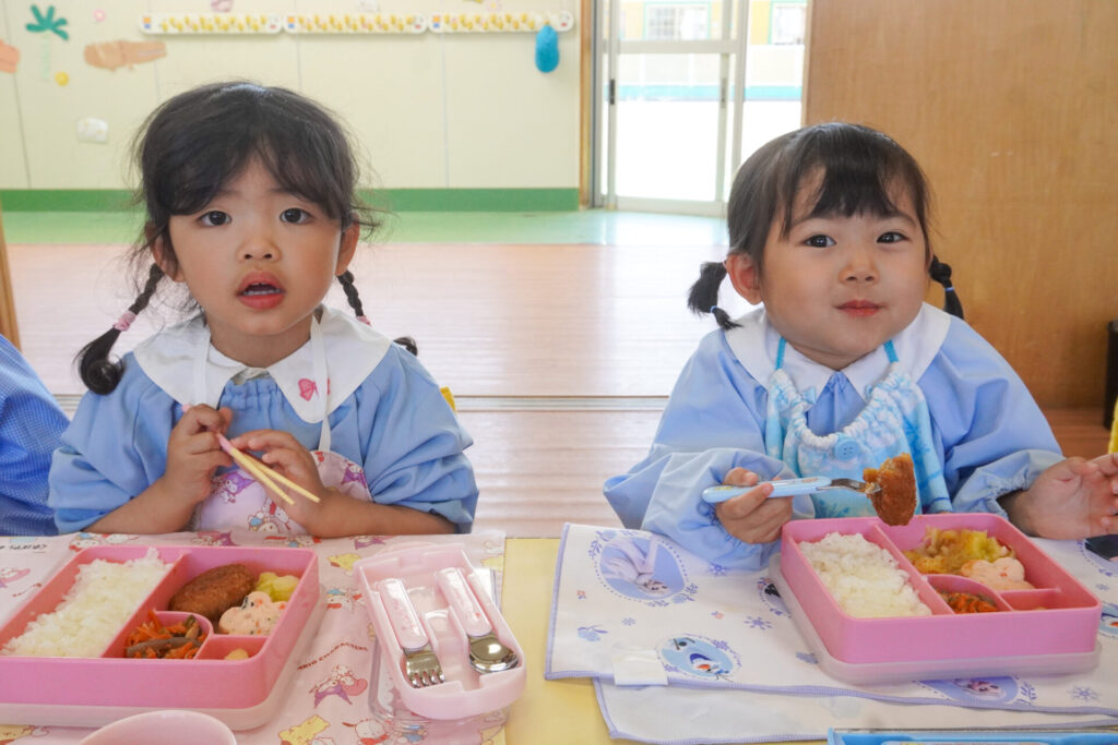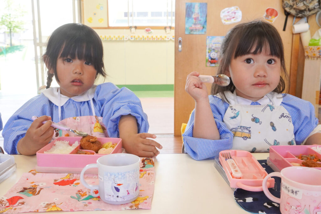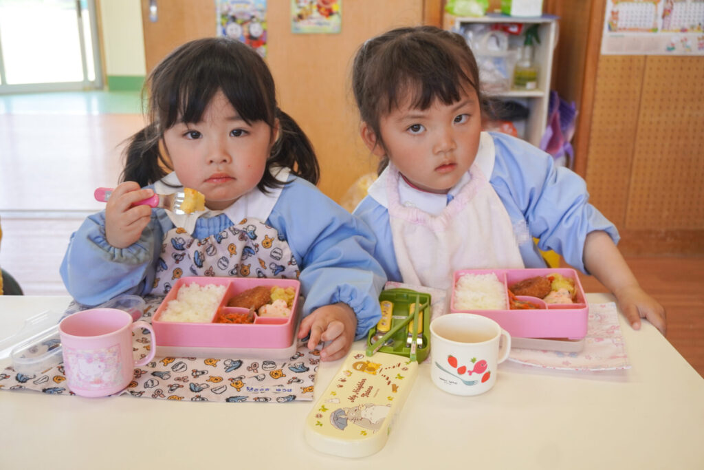 園での様子 給食(年少) madokahp 2026年4月14日 年少ゆり組・ばら組で食べる初めての「給食の日」でした。 食事の前には、排泄・手洗いをします。手を洗ったらハンカチで手を拭く、通園かばんから、給食セットを取り出して、ランチョンマットを広げる等、少しずつ流れを覚えていきます。 幼稚園で食べる「給食」はおしいですね。食事中は座って食べられるように励ましていきます。「早寝早起き朝ごはん」を合言葉に、規則正しい生活のもと、毎日元気に登園してくださいね。