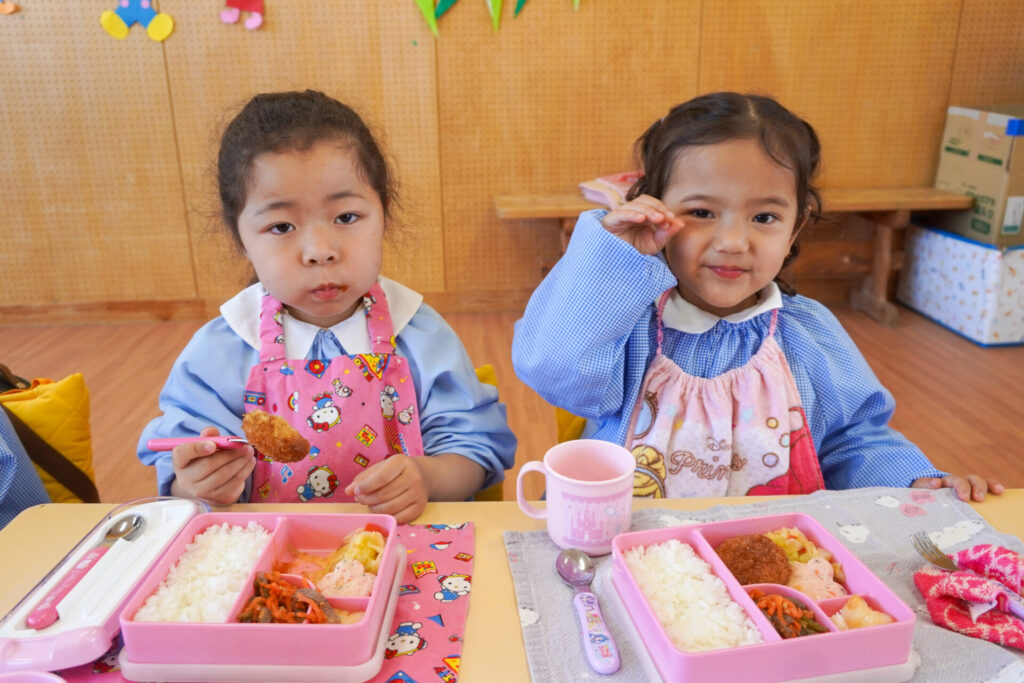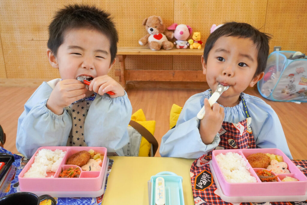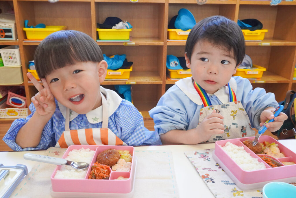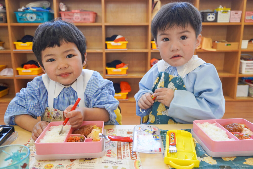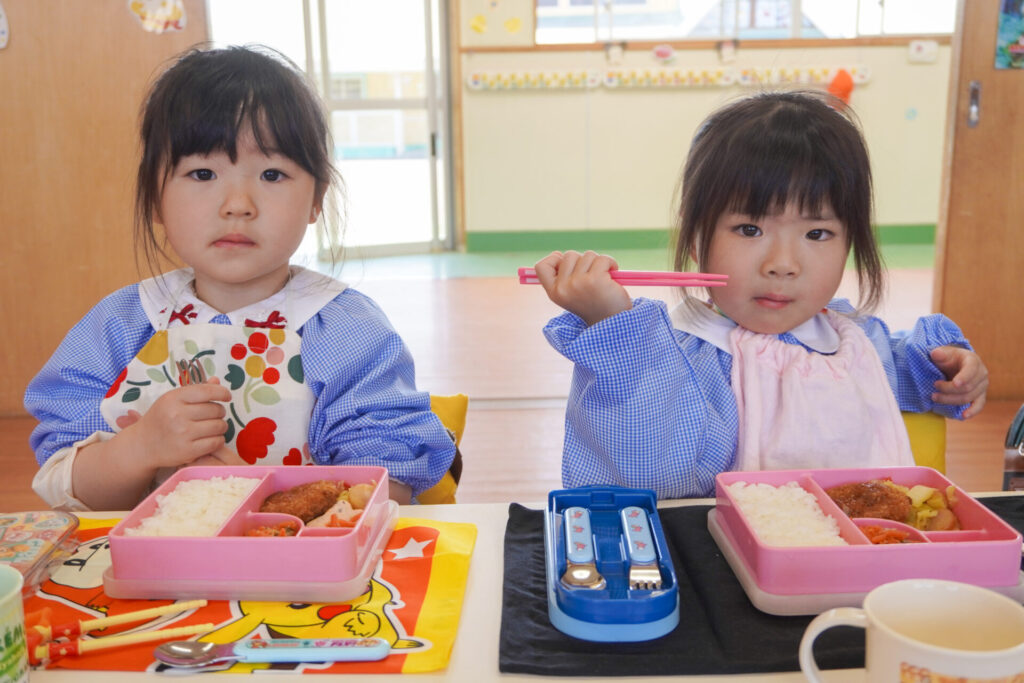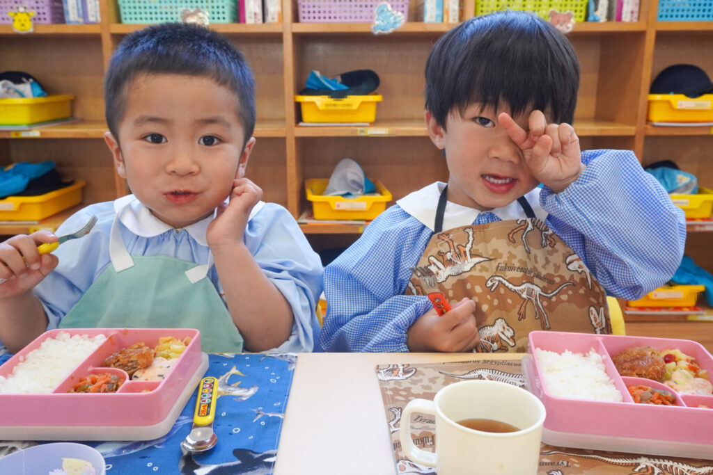 園での様子 給食(年少) madokahp 2026年4月14日 年少ゆり組・ばら組で食べる初めての「給食の日」でした。 食事の前には、排泄・手洗いをします。手を洗ったらハンカチで手を拭く、通園かばんから、給食セットを取り出して、ランチョンマットを広げる等、少しずつ流れを覚えていきます。 幼稚園で食べる「給食」はおしいですね。食事中は座って食べられるように励ましていきます。「早寝早起き朝ごはん」を合言葉に、規則正しい生活のもと、毎日元気に登園してくださいね。