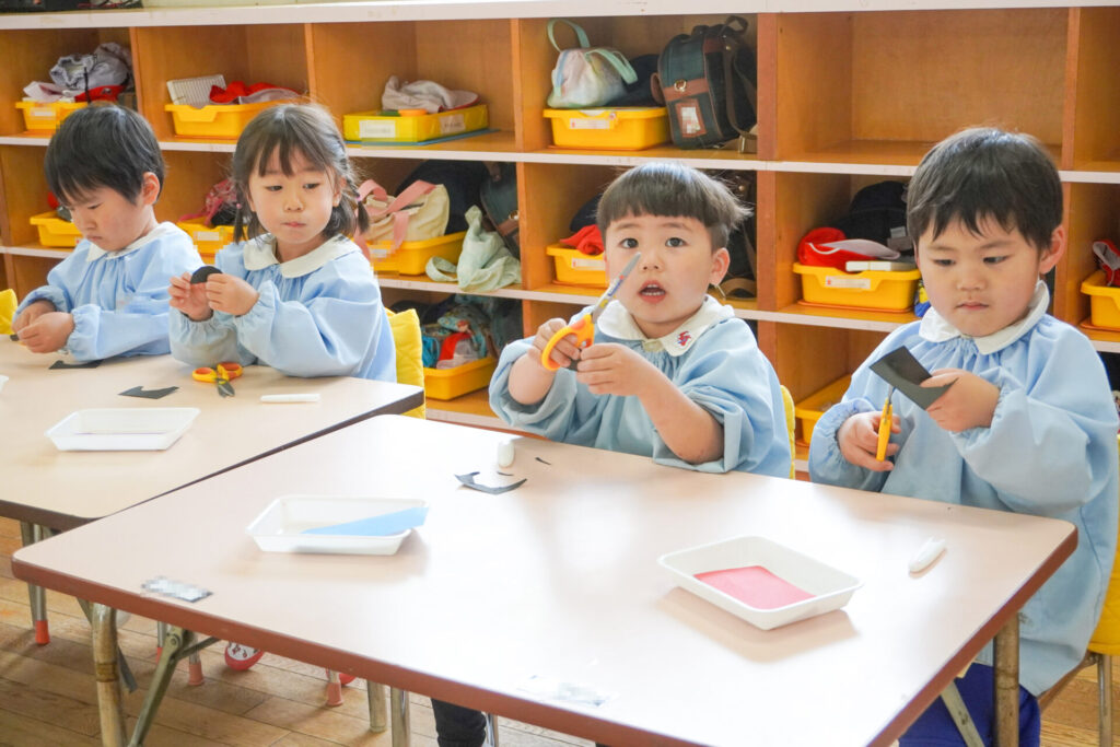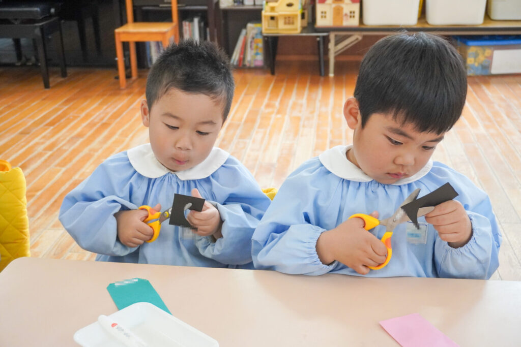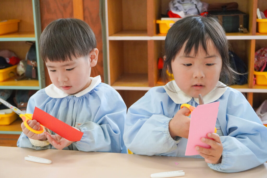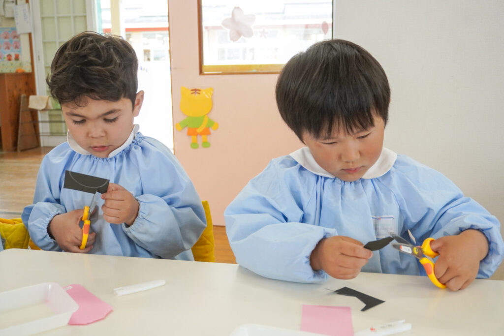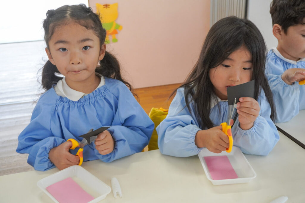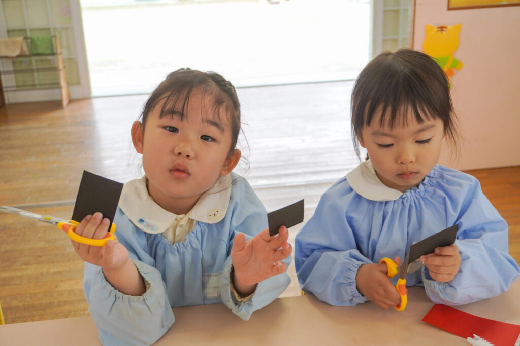 年中さくら組が誕生表に飾る「自分の顔」を作りました。はさみの扱いが上手になり、まっすぐ切ったり、丸く切ったり、きれいに切れるようになりました。今日は活動前に丸く切る時は紙を回しながら切ることも再確認しました。