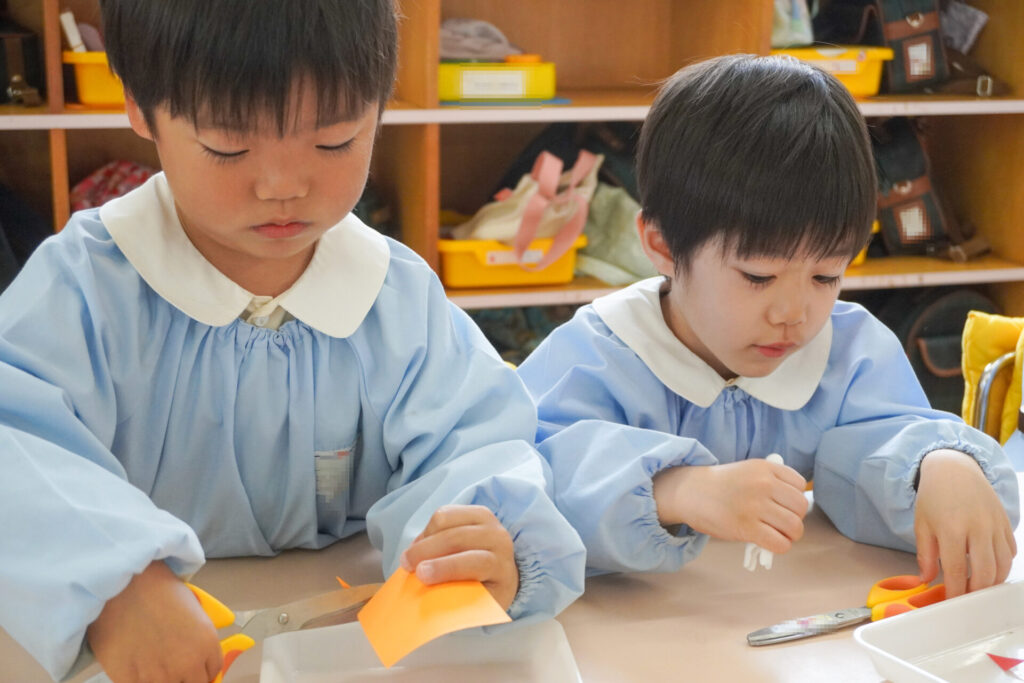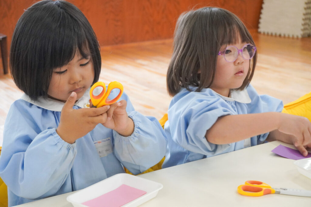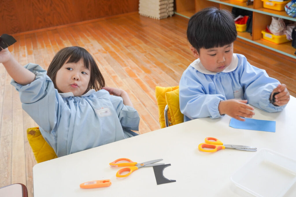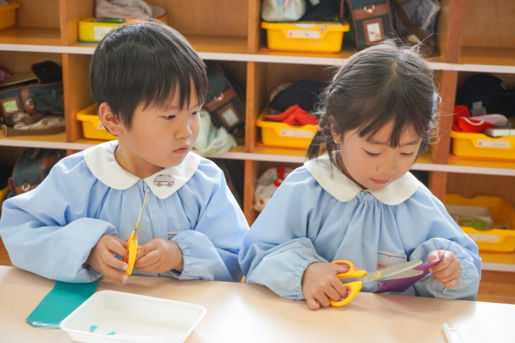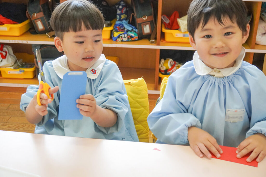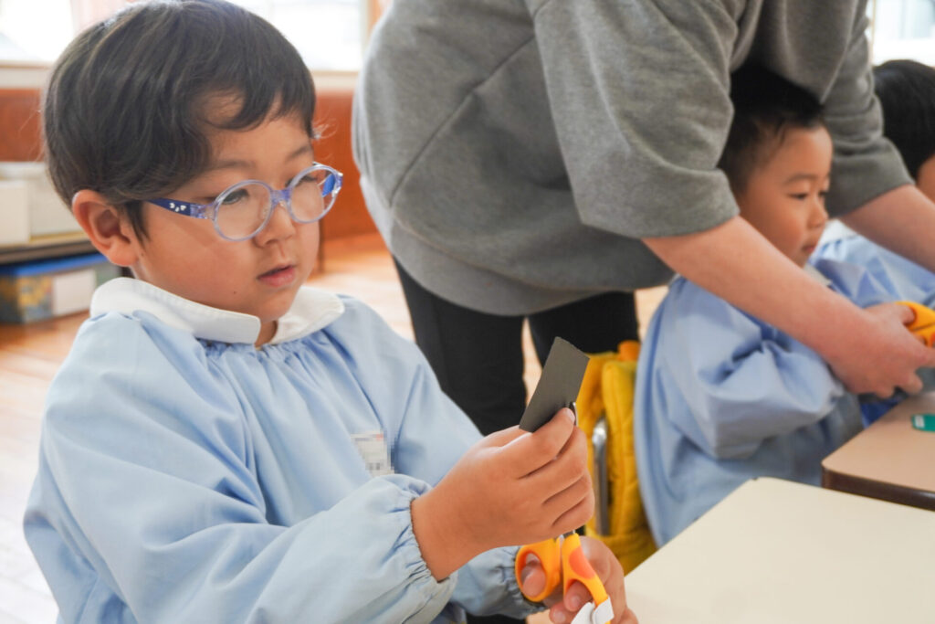 年中さくら組が誕生表に飾る「自分の顔」を作りました。はさみの扱いが上手になり、まっすぐ切ったり、丸く切ったり、きれいに切れるようになりました。今日は活動前に丸く切る時は紙を回しながら切ることも再確認しました。