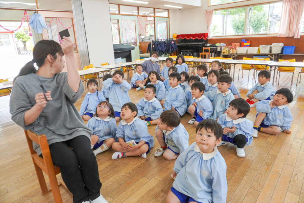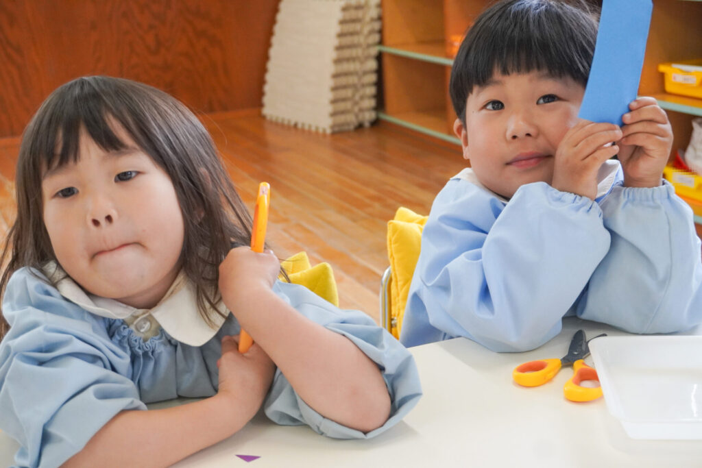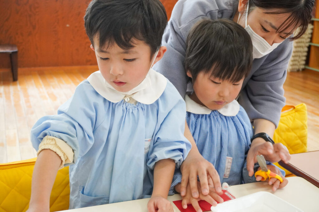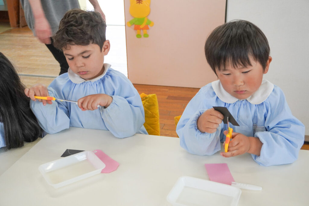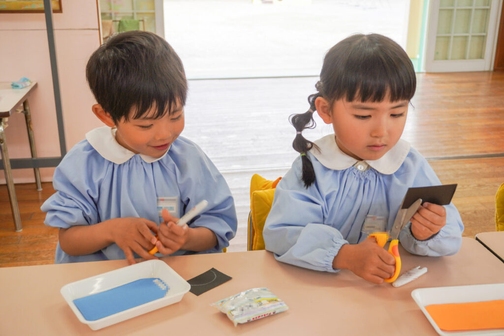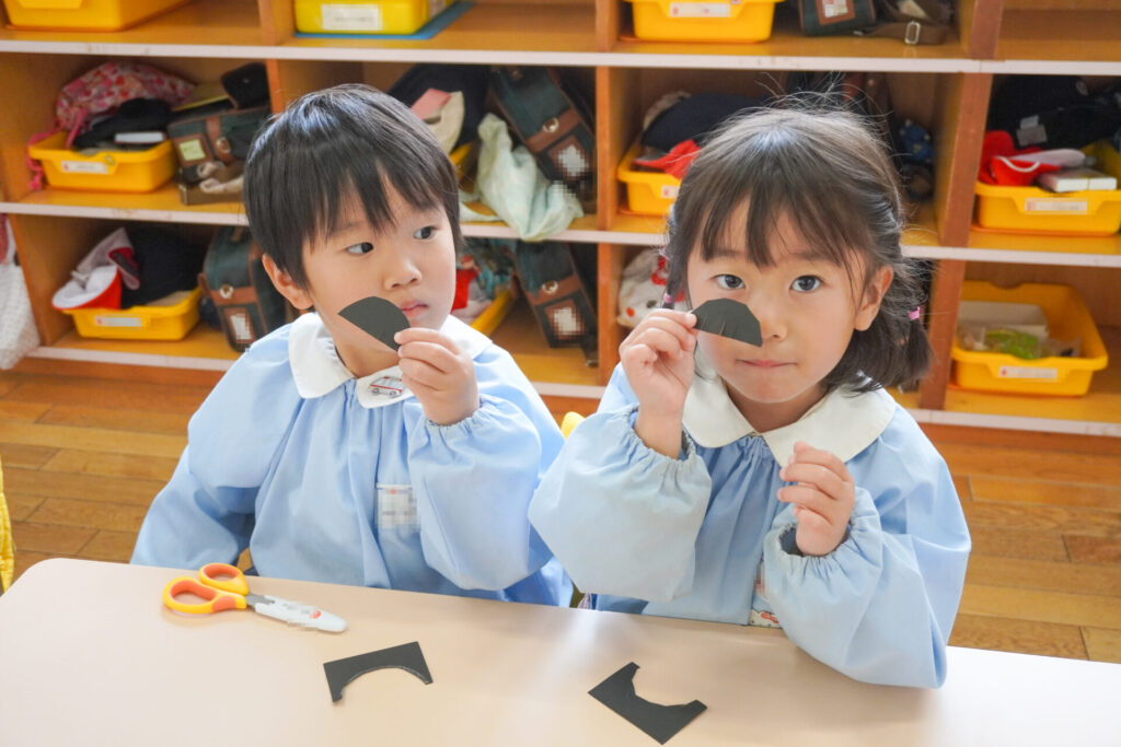 年中さくら組が誕生表に飾る「自分の顔」を作りました。はさみの扱いが上手になり、まっすぐ切ったり、丸く切ったり、きれいに切れるようになりました。今日は活動前に丸く切る時は紙を回しながら切ることも再確認しました。