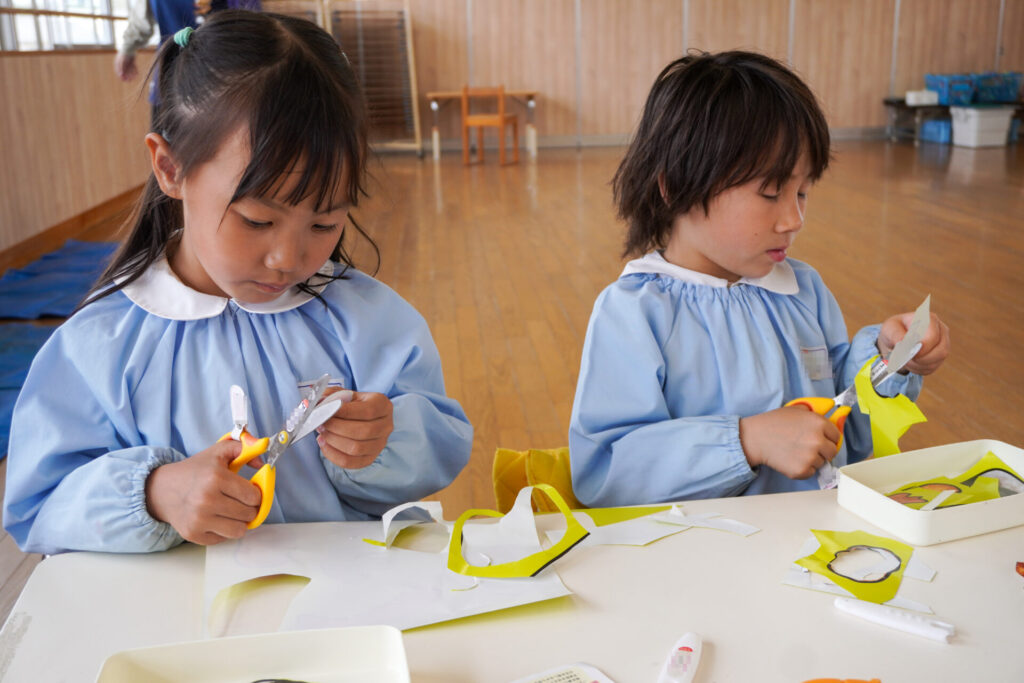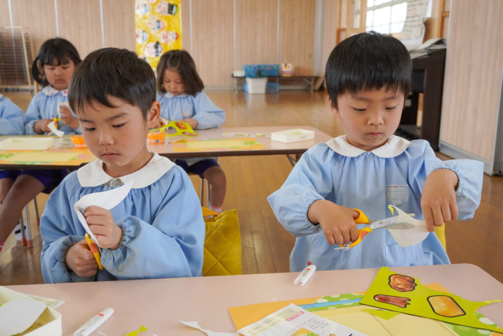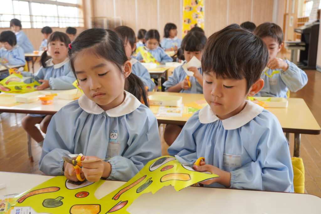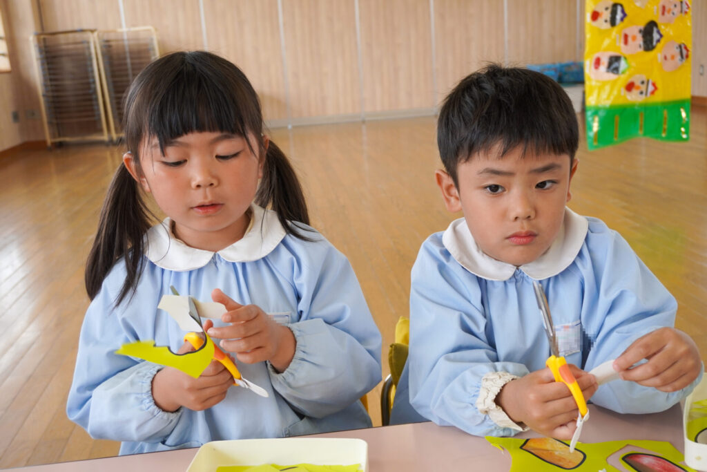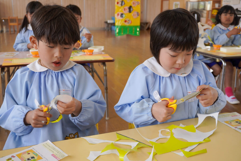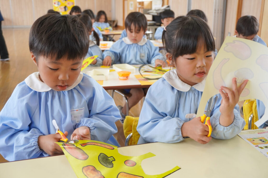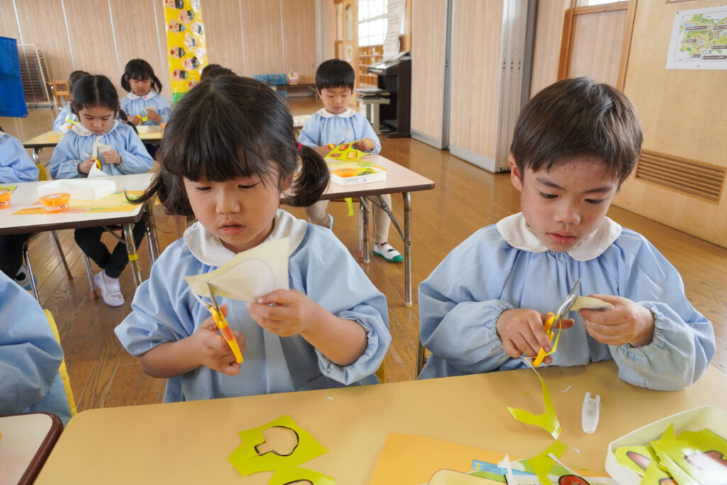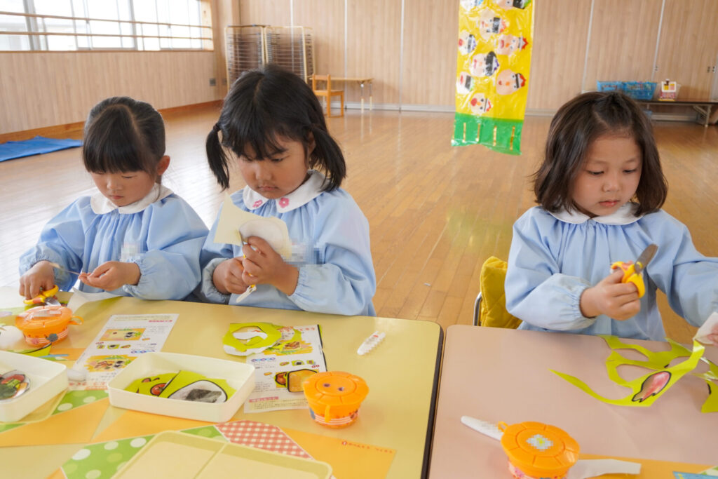 園での様子 切り紙遊び(年長) madokahp 2026年4月20日 制作が大好きな年長つき組です。はさみの扱いが上手になり、丸や三角以外の不定形を切れるようになりました。はさみの刃は上に向けること、切る時は紙を回すことを頭に入れて、切り紙遊びを行いました。 今日の題材は「おべんとう」です。おにぎりの「三角」、ブロッコリーやから揚げの「不定形」など、形に切ってお弁当に詰め合わせて貼りました。作った「お弁当」を持って、どこかに出かけたいですね。 いろいろな形を切ったり貼ったりして、これからも楽しく造形遊びをしていきます。